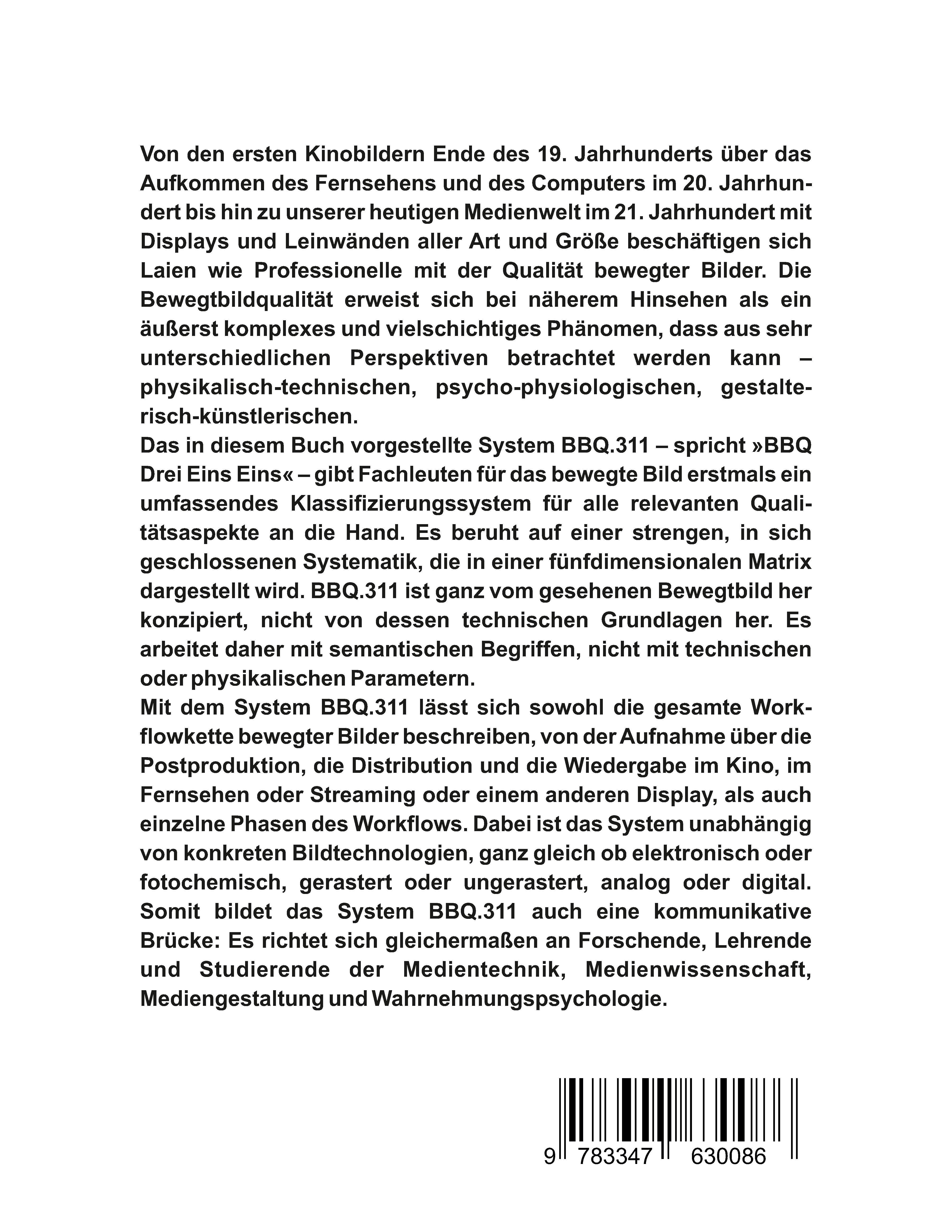 Von den ersten Kinobildern Ende des 19. Jahrhunderts über das Aufkommen des Fernsehens und des Computers im 20. Jahrhundert bis hin zu unserer heutigen Medienwelt im 21. Jahrhundert mit Displays und Leinwänden aller Art und Größe beschäftigen sich Laien wie Professionelle mit der Qualität bewegter Bilder. Die Bewegtbildqualität erweist sich bei näherem Hinsehen als ein äußerst komplexes und vielschichtiges Phänomen, dass aus sehr unterschiedlichen Perspektiven betrachtet werden kann - physikalisch-technischen, psycho-physiologischen, gestalterisch-künstlerischen. Das in diesem Buch vorgestellte System BBQ.311 - spricht »BBQ Drei Eins Eins« - gibt Fachleuten für das bewegte Bild erstmals ein umfassendes Klassifizierungssystem für alle relevanten Qualitätsaspekte an die Hand. Es beruht auf einer strengen, in sich geschlossenen Systematik, die in einer fünfdimensionalen Matrix dargestellt wird. BBQ.311 ist ganz vom gesehenen Bewegtbild her konzipiert, nicht von dessen technischen Grundlagen her. Es arbeitet daher mit semantischen Begriffen, nicht mit technischen oder physikalischen Parametern. Mit dem System BBQ.311 lässt sich sowohl die gesamte Workflowkette bewegter Bilder beschreiben, von der Aufnahme über die Postproduktion, die Distribution und die Wiedergabe im Kino, im Fernsehen oder Streaming oder einem anderen Display, als auch einzelne Phasen des Workflows. Dabei ist das System unabhängig von konkreten Bildtechnologien, ganz gleich ob elektronisch oder fotochemisch, gerastert oder ungerastert, analog oder digital. Somit bildet das System BBQ.311 auch eine kommunikative Brücke: Es richtet sich gleichermaßen an Forschende, Lehrende und Studierende der Medientechnik, Medienwissenschaft, Mediengestaltung und Wahrnehmungspsychologie.