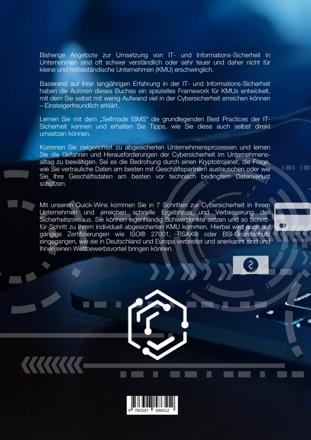 IT-Sicherheit in kleinen und mittelständischen Unternehmen voranbringenIT- und Informations-Sicherheit ist ein komplexes Thema und die Umsetzung nimmt oft viel Zeit und viele Ressourcen in Anspruch. Bisherige Angebote zur Umsetzung oder Beratung zu Informationssicherheit in Unternehmen sind oft schwer verständlich oder sehr teuer und daher nicht für kleine und mittelständische Unternehmen (KMU) erschwinglich. Als Resultat sind viele Unternehmen nur unzureichend gegen aktuelle Hackerangriffe geschützt, wissen nicht wie Sie die Cybersicherheit erhöhen oder Compliance zu z.B. Datenschutzvorgaben wie zur EU-DSGVO herstellen können.Basierend auf ihrer langjährigen Erfahrung in der IT- und Informations-Sicherheit haben die Autoren dieses Buches ein spezielles Framework für KMUs entwickelt, mit dem Sie selbst mit wenig Aufwand viel in der Cybersicherheit erreichen können - Einsteigerfreundlich erklärt.Lernen Sie mit dem "Selfmade ISMS" die grundlegenden Best Practices der IT-Sicherheit kennen und erhalten Sie Tipps, wie Sie diese auch selbst direkt umsetzen können. Sie als Geschäftsführer kennen die Risiken Ihres Unternehmens doch am besten oder Sie als IT-Administrator wissen auch genau wo die Probleme in dem von Ihnen verwalteten Netzwerk liegen.Kommen Sie zielgerichtet zu abgesicherten Unternehmensprozessen und lernen Sie die Gefahren und Herausforderungen der Cybersicherheit im Unternehmensalltag zu bewältigen. Sei es die Bedrohung durch einen Kryptotrojaner, die Frage, wie Sie vertrauliche Daten am besten mit Geschäftspartnern austauschen oder wie Sie Ihre Geschäftsdaten am besten vor technisch bedingtem Datenverlust schützen. Mit unseren Quick-Wins kommen Sie in 7 Schritten zur Cybersicherheit in Ihrem Unternehmen und erreichen schnelle Ergebnisse und Verbesserung des Sicherheitsniveaus. Sie können eigenhändig Schwerpunkte setzen und so Schritt-für-Schritt zu Ihrem individuell abgesicherten KMU kommen. Hierbei wird auch auf gängige Zertifizierungen wie ISO® 27001, TISAX® oder BSI-Grundschutz einge-gangen, wie sie in Deutschland und Europa verbreitet und anerkannt sind und Ihnen einen Wettbewerbsvorteil bringen können.Das komplexe Thema IT- und Informations-Sicherheit wird hier von Grund auf ausführlich erläutert und bietet den idealen Einstieg in die Welt der Informationssicherheit.