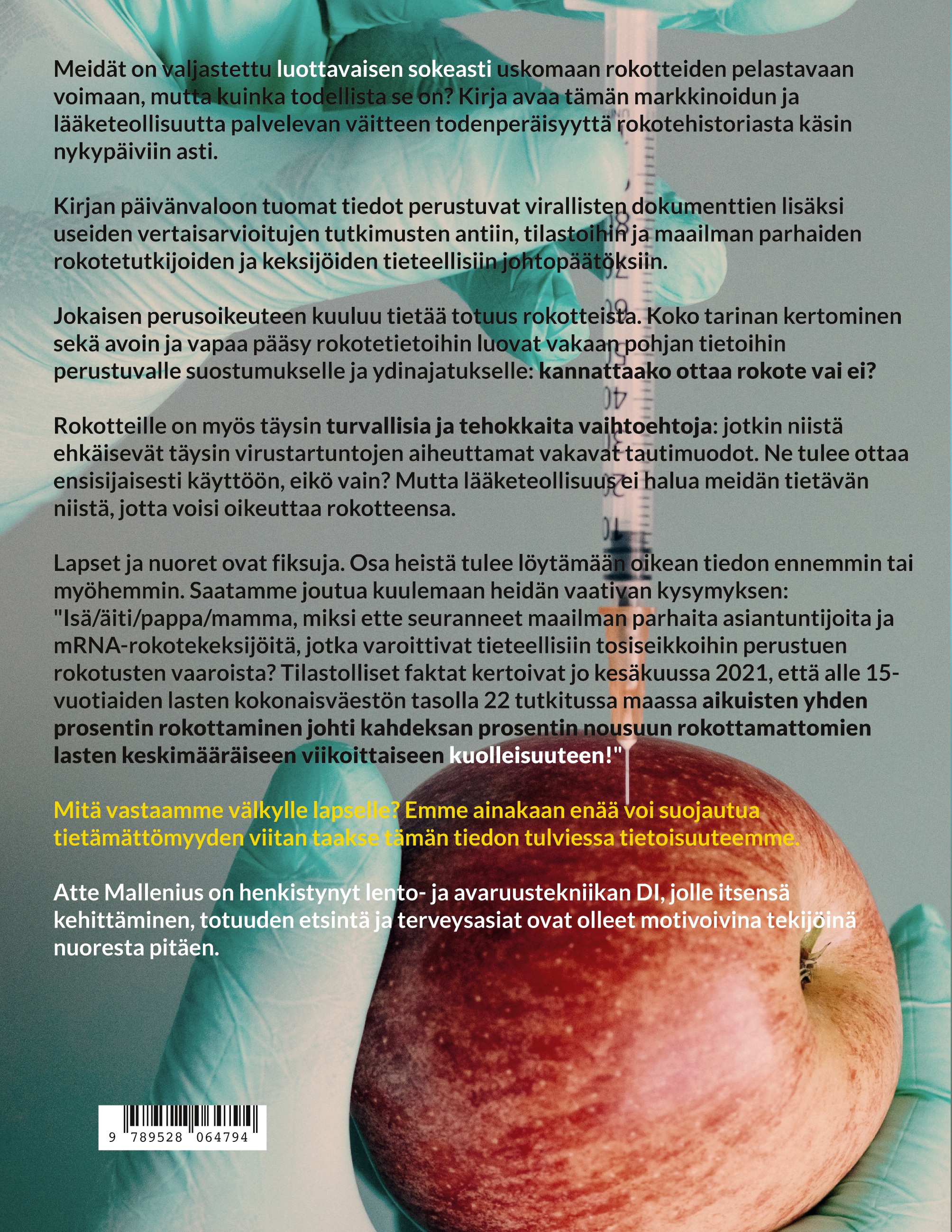 Meidät on valjastettu luottavaisen sokeasti uskomaan rokotteiden pelastavaan voimaan, mutta kuinka todellista se on? Kirja avaa tämän markkinoidun ja lääketeollisuutta palvelevan väitteen todenperäisyyttä rokotehistoriasta käsin nykypäiviin asti.
