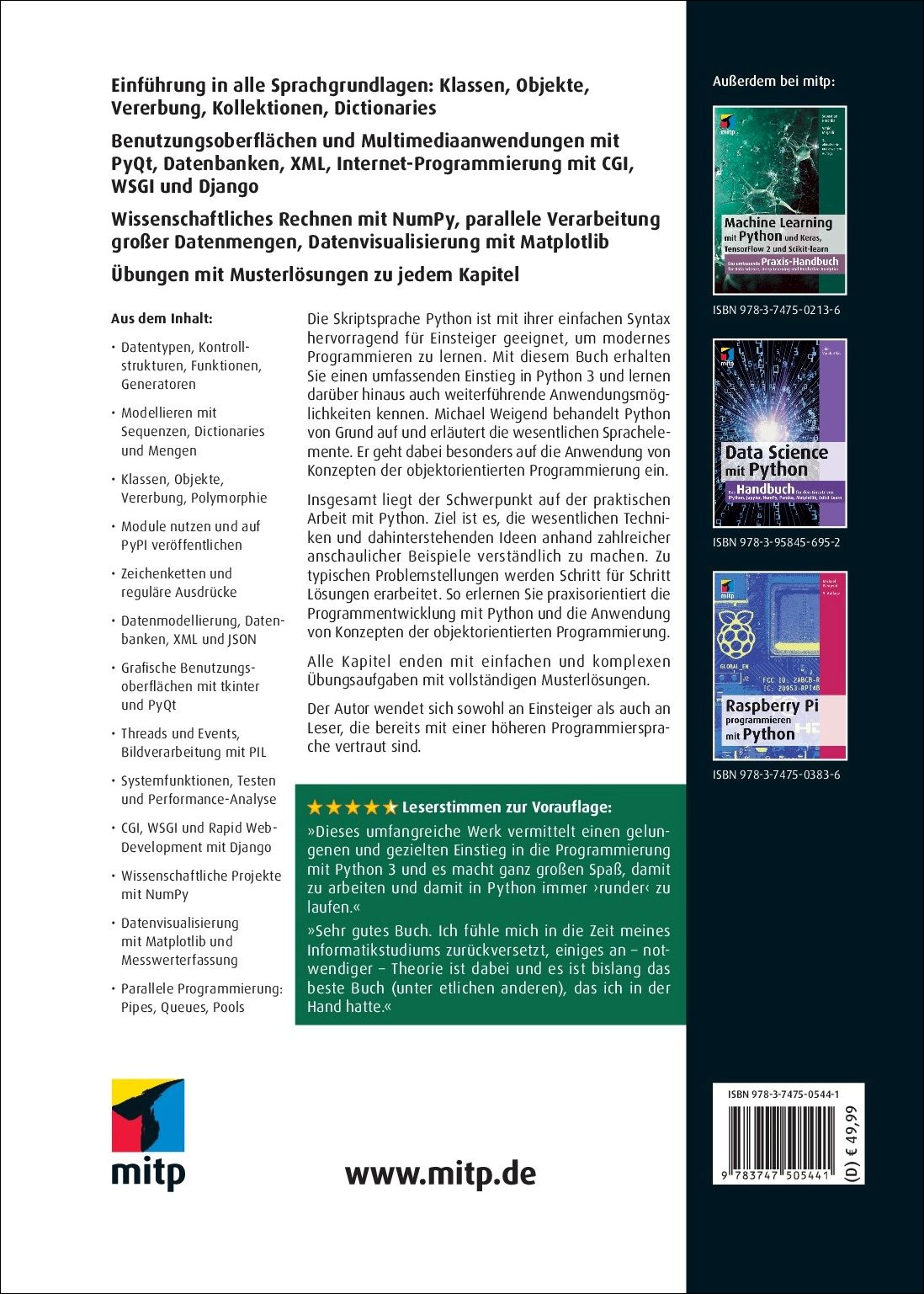 »Michael Weigend liefert in der aktuellen Auflage seines Standardwerks zu Python einen umfassenden Einstieg in die Sprache. Das Buch geht systematisch von den einfachen Dingen zu den komplexeren über. [...] Zahlreiche Beispiele, Musterlösungen und Übungsaufgaben setzen die theoretischen Erläuterungen um.« (dotnetpro.de, 11/2019)