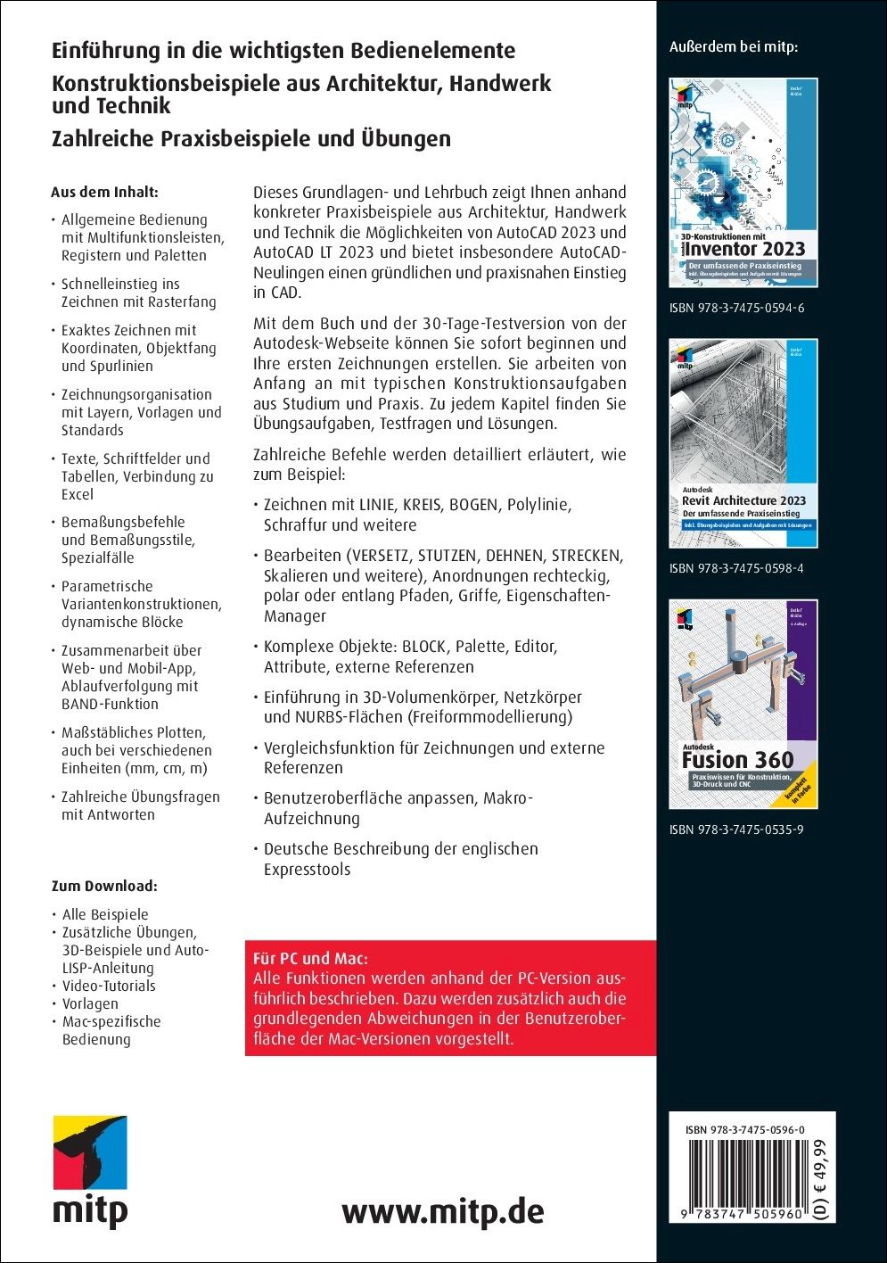 Mit dem Buch und der 30-Tage-Testversion von der Autodesk-Webseite können Sie sofort beginnen und Ihre ersten Zeichnungen erstellen. Sie arbeiten von Anfang an mit typischen Konstruktionsaufgaben aus Studium und Praxis. Zu jedem Kapitel finden Sie Übungsaufgaben, Testfragen und Lösungen.