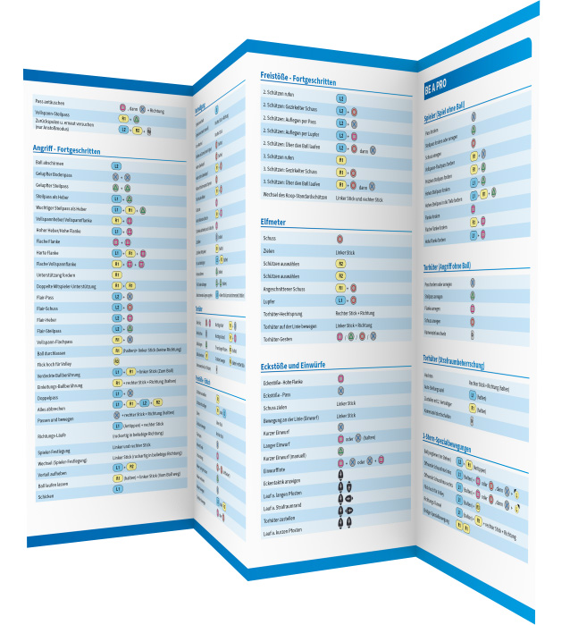 Du willst rechts antäuschen und links gehen? Oder einen Zweikampf mit deinem Gegner souverän für Dich entscheiden? Mit dieser praktischen Übersicht hast Du jetzt alle wichtigen Steuerungen im Spiel ohne lange zu suchen immer griffbereit und auf einen Blick! Die Klappkarte ist sehr robust. Und wenn Du beim spielen etwas verschüttest ist das auch kein Problem - die Karte ist mit einer hochwertigen Schutzfolie überzogen und somit abwischbar. Diese Version beinhaltet die Steuerungsbefehle für PlayStation-Controller.