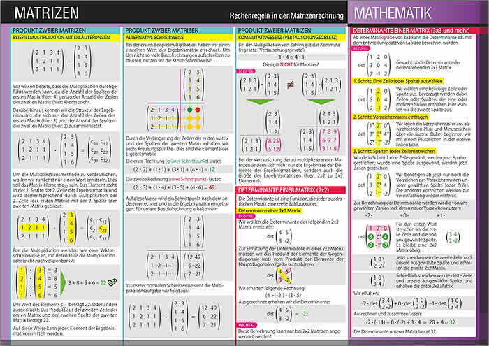 Eine Matrix ist eine rechteckige Anordnung von mathematischen Objekten. Auf diese Weise können verschiedene Zusammenhänge übersichtlich dargestellt und berechnet werden. Es gibt dabei eine Reihe wichtiger Rechenregeln, die für die korrekte Nutzung von Matrizen Anwendung finden.Du möchtest dein Wissen festigen?Du benötigst einen zuverlässigen Helfer bei der Nachhilfe? Diese Info-Tafel ist der perfekte Einstieg in die Matrizenrechnung - übersichtlich, klar und mit Beispielen versehen.Optimal einzusetzen in Schule, Ausbildung, Studium und Beruf, bei der Nachhilfe (auch zum Selbststudium) sowie zum Auffrischen nach längerer 'Mathe-Abstinenz'.