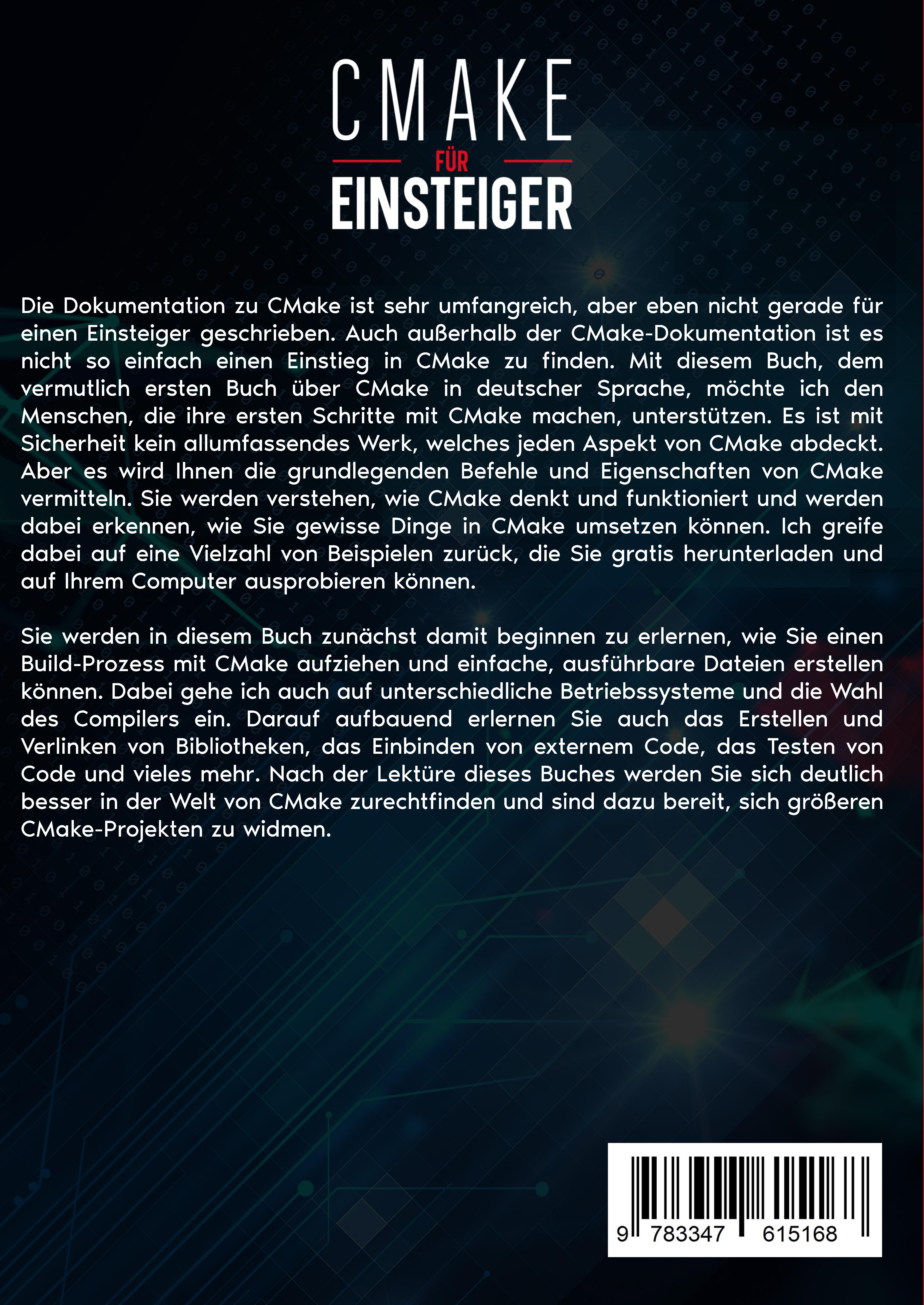 Die Dokumentation zu CMake ist sehr umfangreich, aber eben nicht gerade für einen Einsteiger geschrieben. Auch außerhalb der CMake-Dokumentation ist es nicht so einfach einen Einstieg in CMake zu finden. Mit diesem Buch, dem vermutlich ersten Buch über CMake in deutscher Sprache, möchte ich den Menschen, die ihre ersten Schritte mit CMake machen, unterstützen. Es ist mit Sicherheit kein allumfassendes Werk, welches jeden Aspekt von CMake abdeckt. Aber es wird Ihnen die grundlegenden Befehle und Eigenschaften von CMake vermitteln. Sie werden verstehen, wie CMake denkt und funktioniert und werden dabei erkennen, wie Sie gewisse Dinge in CMake umsetzen können. Ich greife dabei auf eine Vielzahl von Beispielen zurück, die Sie gratis herunterladen und auf Ihrem Computer ausprobieren können.Sie werden in diesem Buch zunächst damit beginnen zu erlernen, wie Sie einen Build-Prozess mit CMake aufziehen und einfache, ausführbare Dateien erstellen können. Dabei gehe ich auch auf unterschiedliche Betriebssysteme und die Wahl des Compilers ein. Darauf aufbauend erlernen Sie auch das Erstellen und Verlinken von Bibliotheken, das Einbinden von externem Code, das Testen von Code und vieles mehr. Nach der Lektüre dieses Buches werden Sie sich deutlich besser in der Welt von CMake zurechtfinden und sind dazu bereit, sich größeren CMake-Projekten zu widmen.