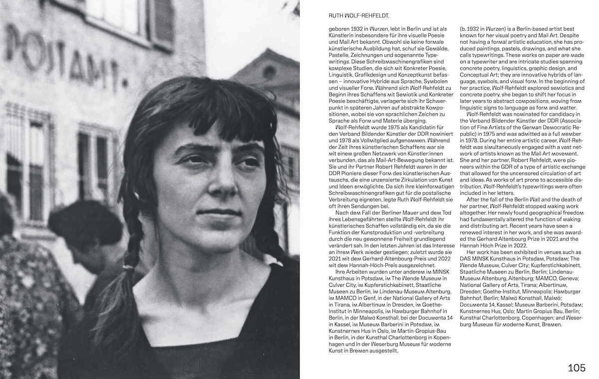 RUTH WOLF-REHFELDT (*1932, Wurzen, Sachsen) kam 1950 nach Berlin. Seit den 1960er-Jahren schuf sie als Autodidaktin Gemälde, Pastelle, Zeichnungen und ab etwa 1970 sogenannte Typewritings. Aus der DDR heraus beteiligte sie sich aktiv am internationalen Mail-Art-Programm. Erst in den vergangenen Jahren erlebt sie eine Wiederentdeckung - 2017 war sie mit ihren Typewritings Newcomerin und zugleich der älteste Star der documenta 14.
