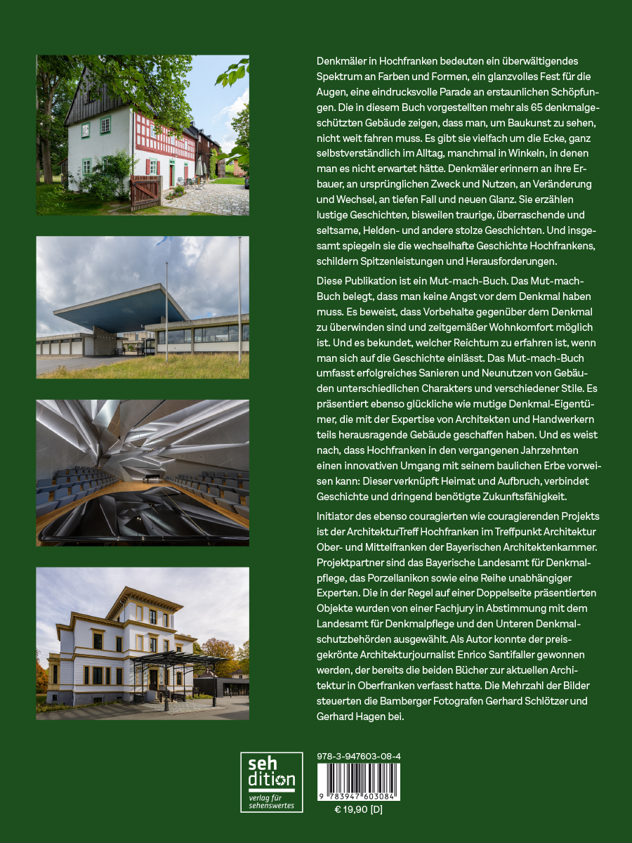 Denkmäler in Hochfranken bedeuten ein überwältigendes Spektrum an Farben und Formen, ein glanzvolles Fest für die Augen, eine eindrucksvolle Parade an erstaunlichen Schöpfungen.Die in diesem Buch vorgestellten mehr als 65 denkmalgeschützten Gebäude zeigen, dass man, um Baukunst zu sehen,nicht weit fahren muss. Es gibt sie vielfach um die Ecke, ganz selbstverständlich im Alltag, manchmal in Winkeln, in denen man es nicht erwartet hätte. Denkmäler erinnern an ihre Erbauer, an ursprünglichen Zweck und Nutzen, an Veränderung und Wechsel, an tiefen Fall und neuen Glanz. Sie erzählen lustige Geschichten, bisweilen traurige, überraschende undseltsame, Helden- und andere stolze Geschichten. Und insgesamt spiegeln sie die wechselhafte Geschichte Hochfrankens, schildern Spitzenleistungen und Herausforderungen.Diese Publikation ist ein Mut-mach-Buch. Das Mut-mach-Buch belegt, dass man keine Angst vor dem Denkmal haben muss. Es beweist, dass Vorbehalte gegenüber dem Denkmal zu überwinden sind und zeitgemäßer Wohnkomfort möglich ist. Und es bekundet, welcher Reichtum zu erfahren ist, wenn man sich auf die Geschichte einlässt. Das Mut-mach-Buchumfasst erfolgreiches Sanieren und Neunutzen von Gebäuden unterschiedlichen Charakters und verschiedener Stile. Es präsentiert ebenso glückliche wie mutige Denkmal-Eigentümer, die mit der Expertise von Architekten und Handwerkernteils herausragende Gebäude geschaffen haben. Und es weist nach, dass Hochfranken in den vergangenen Jahrzehnteneinen innovativen Umgang mit seinem baulichen Erbe vorweisen kann: Dieser verknüpft Heimat und Aufbruch, verbindetGeschichte und dringend benötigte Zukunftsfähigkeit.Initiator des ebenso couragierten wie couragierenden Projekts ist der ArchitekturTreff Hochfranken im Treffpunkt Architektur Ober- und Mittelfranken der Bayerischen Architektenkammer. Projektpartner sind das Bayerische Landesamt für Denkmalpflege, das Porzellanikon sowie eine Reihe unabhängiger Experten. Die in der Regel auf einer Doppelseite präsentierten Objekte wurden von einer Fachjury in Abstimmung mit dem Landesamt für Denkmalpflege und den Unteren Denkmalschutzbehörden ausgewählt. Als Autor konnte der preisgekrönte Architekturjournalist Enrico Santifaller gewonnenwerden, der bereits die beiden Bücher zur aktuellen Architektur in Oberfranken verfasst hatte. Die Mehrzahl der Bildersteuerten die Bamberger Fotografen Gerhard Schlötzer und Gerhard Hagen bei.