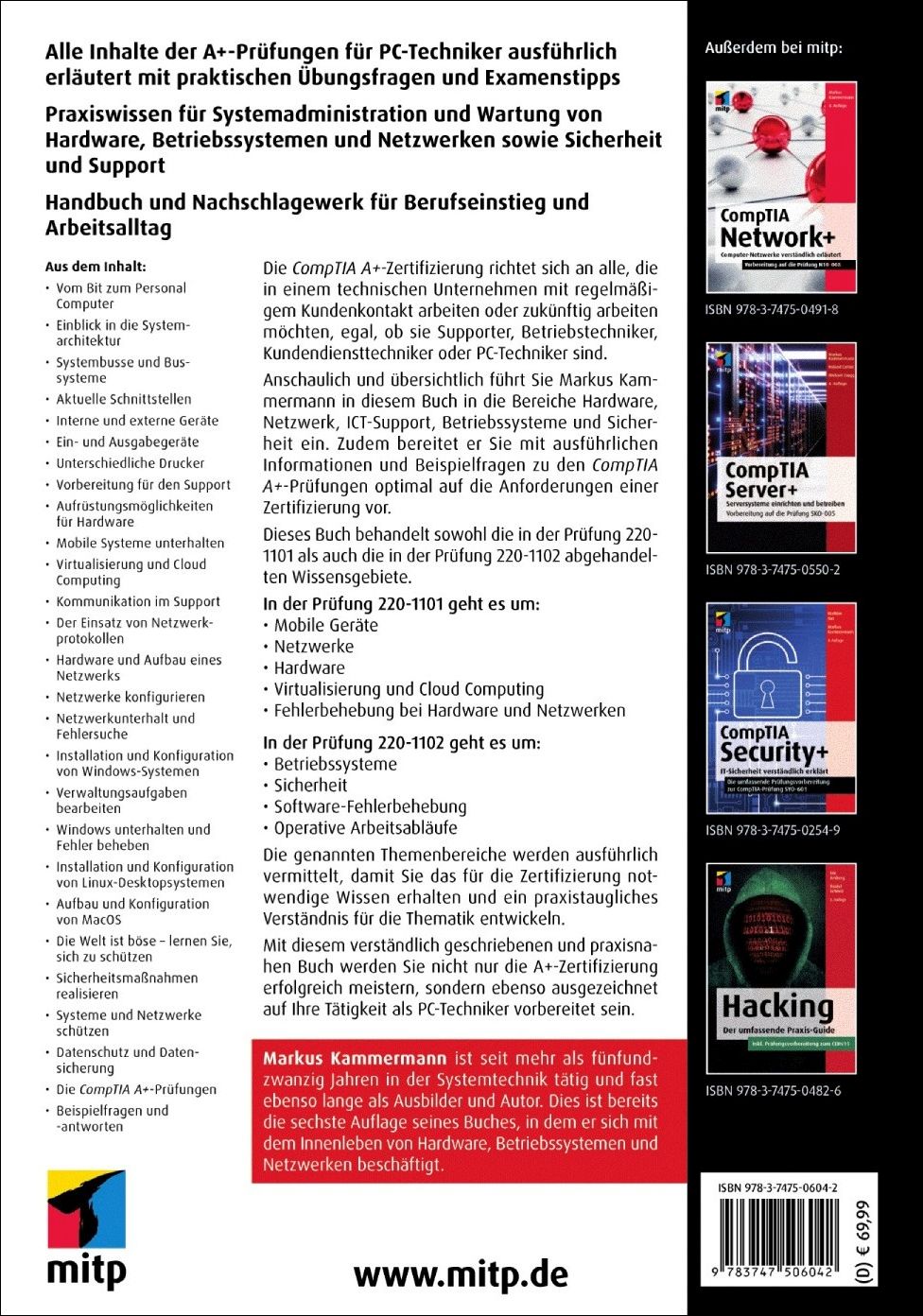 Mit diesem verständlich geschriebenen und praxisnahen Buch werden Sie nicht nur die A+-Zertifizierung erfolgreich meistern, sondern ebenso ausgezeichnet auf Ihre Tätigkeit als PC-Techniker vorbereitet sein.