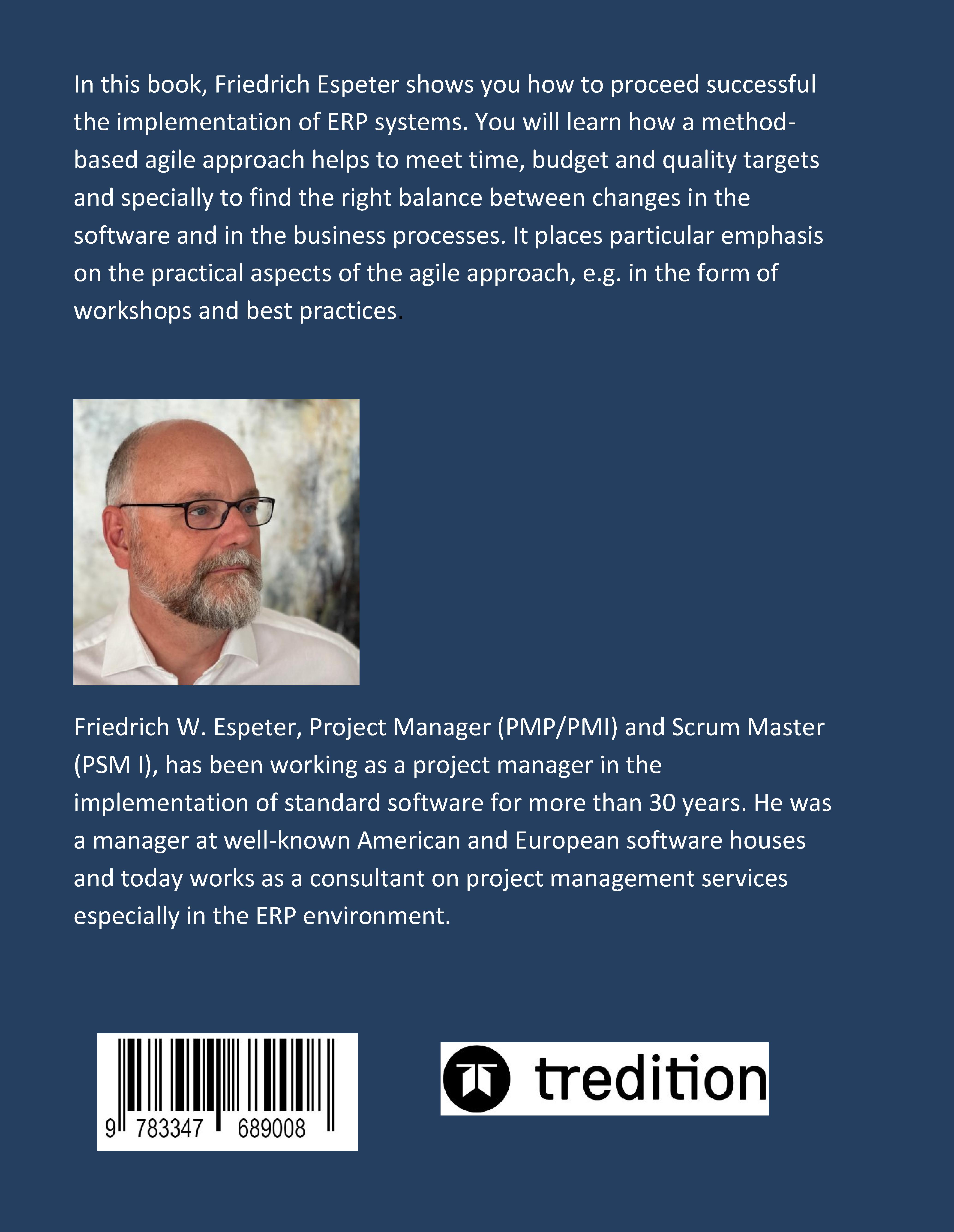 In this book, Friedrich Espeter shows you how to proceed successful the implementation of ERP systems. You will learn how a method-based agile approach helps to meet time, budget and quality targets and specially to find the right balance between changes in the software and in the business processes. It places particular emphasis on the practical aspects of the agile approach, e.g. in the form of workshops and best practices
