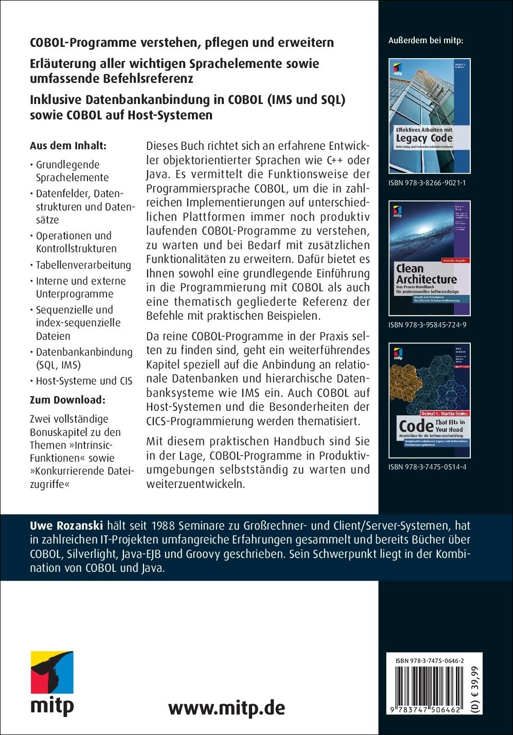 Dieses Buch richtet sich an erfahrene Entwickler objektorientierter Sprachen wie C++ oder Java. Es vermittelt die Funktionsweise der Programmiersprache COBOL, um damit die in zahlreichen Implementierungen auf unterschiedlichen Plattformen immer noch produktiv laufenden COBOL-Programme verstehen und warten zu können. Dabei werden sowohl die Grundlagen der Programmierung mit COBOL als auch die Besonderheiten im Vergleich zu modernen Sprachen vermittelt.