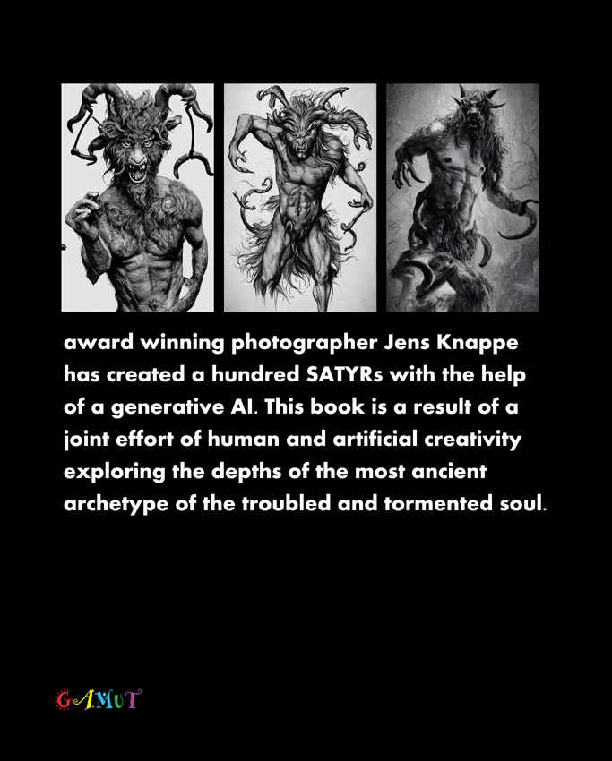 award winning photographer Jens Knappe has created a hundred SATYRs with the help of a generative AI. This book is a result of a joint effort of human and artificial creativity exploring the depths of the most ancient archetype of the troubled and tormented soul.