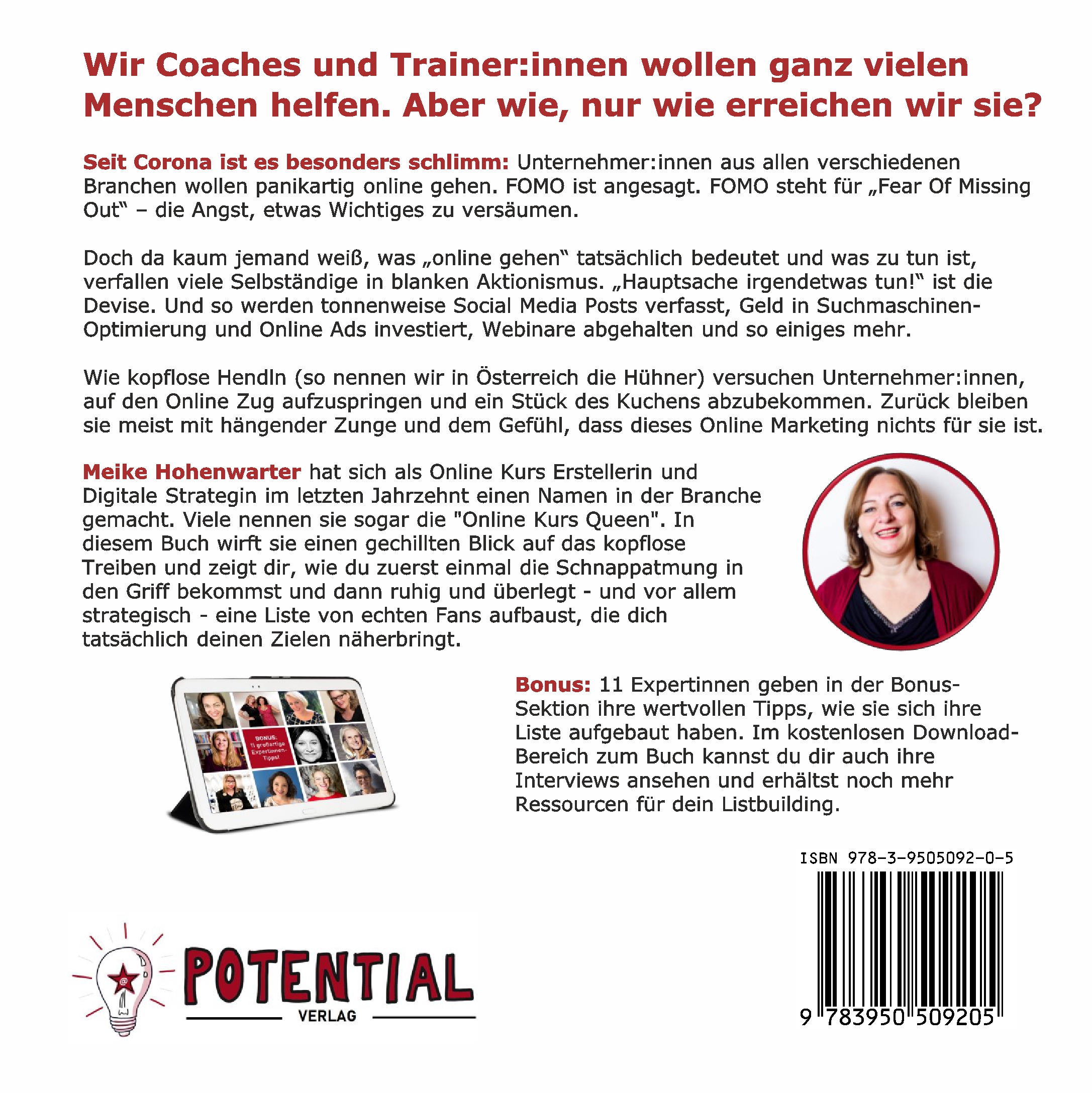 Seit Corona ist es besonders schlimm:UnternehmerInnen aus allen verschiedenen Branchen wollen panikartig online gehen. FOMO ist angesagt. FOMO steht für "Fear Of Missing Out" - die Angst etwas Wichtiges zu versäumen.Doch da kaum jemand weiß, was "online gehen" tatsächlich bedeutet und was zu tun ist, verfallen viele Selbständige in blanken Aktionismus. "Hauptsache irgendetwas tun!" ist die Devise. Und so werden tonnenweise Social Media Posts verfasst, Geld in Suchmaschinen-Optimierung und Online Ads investiert, Webinare abgehalten und so einiges mehr.Wie kopflose Hendln (so nennen wir in Österreich die Hühner) versuchen UnternehmerInnen, auf den Online Zug aufzuspringen und ein Stück des Kuchens abzubekommen. Zurück bleiben sie meist mit hängender Zunge und dem Gefühl, dass dieses Online Marketing nichts für sie ist.Meike Hohenwarter hat sich als Online Kurs Erstellerin und Digitale Strategin im letzten Jahrzehnt einen Namen in der Branche gemacht. Viele nennen sie sogar die "Online Kurs Queen". In diesem Buch wirft sie einen gechillten Blick auf das kopflose Treiben und zeigt dir, wie du zuerst einmal die Schnappatmung in den Griff bekommst und dann ruhig und überlegt - und vor allem strategisch - eine Liste von echten Fans aufbaust, die dich tatsächlich deinen Zielen näherbringt.Genialer Bonus im Buch: 11 Expertinnen geben in der Bonus-Sektion ihre wertvollen Tipps, wie sie sich ihre Liste aufgebaut haben. Im kostenlosen Download-Bereich zum Buch kannst du dir auch ihre Interviews ansehen und erhältst noch mehr Ressourcen für dein Listbuilding.Diese Expertinnen sind mit an Bord:Shailia Stephens ist Mitgründerin von "Lea & Shailia", ein Online-Coaching- und Coach-Training-Anbieter mit Fokus auf die "3 Prinzipien" und entspannten Erfolg.Susanne Pillokat und Nicole Frenken sind Onlinebusiness-Mentorinnen & Erfolgsexpertinnen für selbständige Frauen. Zusammen haben sie "Mein bestes Jahr" gegründet..Denise Schäricke ist die Lifestyle Architektin und Mentorin für spirituelle Business Rockstars. Sie arbeitet mit Frauen in den besten Jahren, deren Leben sich anfühlt wie ein altes Lieblingskleid, das einfach nicht mehr richtig passt.Mag.ª Irene Fellner, MBA ist Gründerin des Frauenzentrums Soul Sisters und begleitet Frauen aus den Umbrüchen der Lebensmitte in einen neuen Lebensabschnitt.Sandra Picha-Kruder ist in über 20 Ländern aktiv und internationale Sprecherin, sowie Expertin im Bereich smartes Networkmarketing.Angelika Buchmayer hilft Trainern, Beratern und Coaches bei ihrer glasklaren Positionierung, ihrem unverwechselbaren Außenauftritt sowie dem Aufbau eines strategischen NetzwerksJyotiMa Flak macht Menschen zu Leuchttürmen. In ihrer Akademie hilft sie Selbstständigen, mit ihrem Herzensbusiness online sichtbar und mega erfolgreich zu sein.Cécile Jemmett ist Linkedin-Leads-Expertin und Business-Mentorin. Sie hat schon rund 4.500 Unternehmern ihre einfachen Methoden zur Positionierung auf und mit LinkedIn vermittelt.Sabine Votteler ist Expertin für "smarte Businessmodelle". Sie berät Führungskräfte, ManagerInnen und ExpertInnen auf dem Weg zum eigenen Business und Selbstständige bei der Transformation zu smarten Geschäftsmodellen.Christine Schlonski, internationale Unternehmerin, Gründerin der Heart Sells! Academy und Host des Heart Sells! Podcasts zeigt dir die Freude und Freiheit authentisch zu verkaufen.Monica Deters widmet ihr Leben Menschen, deren Träume geplatzt sind und dennoch wieder durchstarten wollen. Sie will, dass so viele Menschen wie möglich, ihr Leben (wieder) schön machen!Das Buch ist reichlich illustriert mit Zeichnungen von Peggy Norbisrath