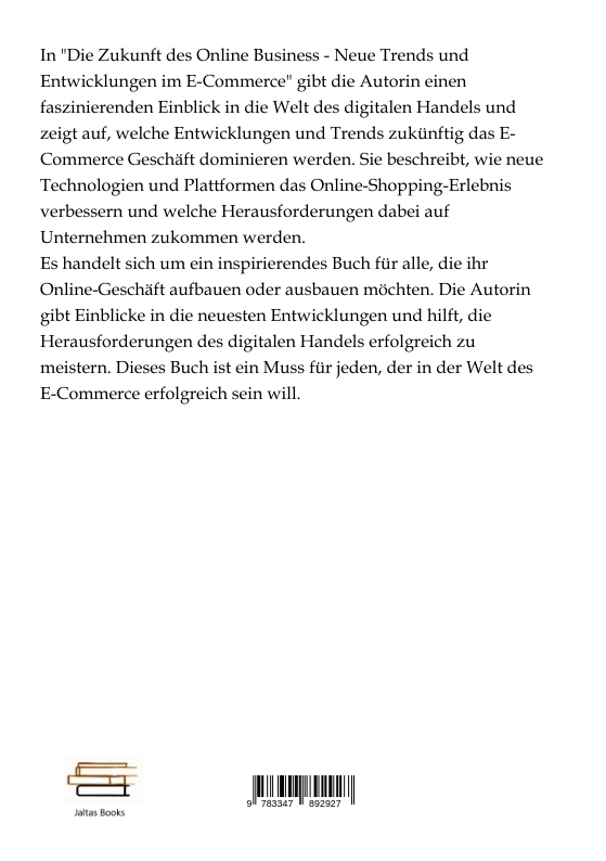 In "Die Zukunft des Online Business - Neue Trends und Entwicklungen im E-Commerce" gibt die Autorin einen faszinierenden Einblick in die Welt des digitalen Handels und zeigt auf, welche Entwicklungen und Trends zukünftig das E-Commerce Geschäft dominieren werden. Sie beschreibt, wie neue Technologien und Plattformen das Online-Shopping-Erlebnis verbessern und welche Herausforderungen dabei auf Unternehmen zukommen werden.Es handelt sich um ein inspirierendes Buch für alle, die ihr Online-Geschäft aufbauen oder ausbauen möchten. Die Autorin gibt Einblicke in die neuesten Entwicklungen und hilft, die Herausforderungen des digitalen Handels erfolgreich zu meistern. Dieses Buch ist ein Muss für jeden, der in der Welt des E-Commerce erfolgreich sein will.