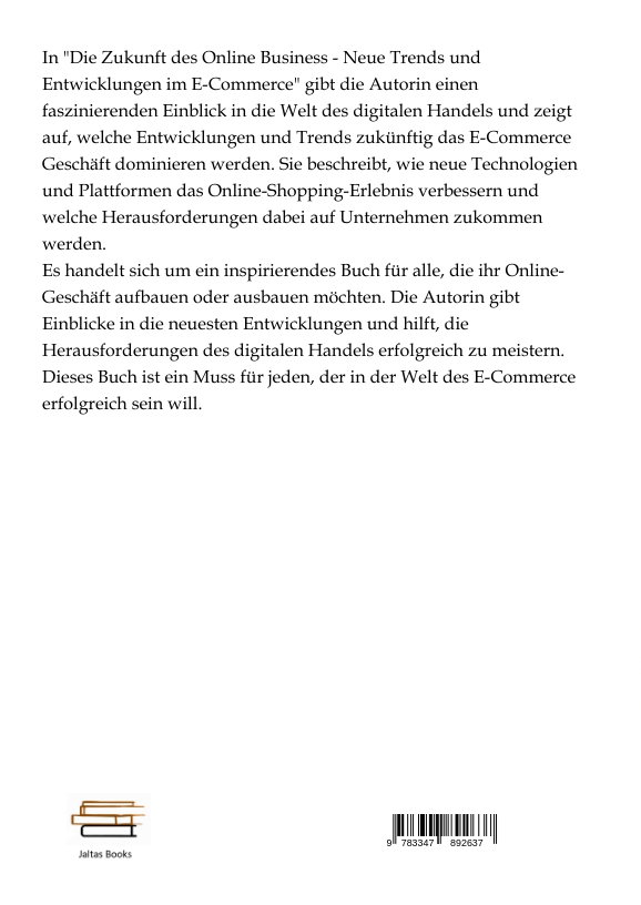 In "Die Zukunft des Online Business - Neue Trends und Entwicklungen im E-Commerce" gibt die Autorin einen faszinierenden Einblick in die Welt des digitalen Handels und zeigt auf, welche Entwicklungen und Trends zukünftig das E-Commerce Geschäft dominieren werden. Sie beschreibt, wie neue Technologien und Plattformen das Online-Shopping-Erlebnis verbessern und welche Herausforderungen dabei auf Unternehmen zukommen werden.Es handelt sich um ein inspirierendes Buch für alle, die ihr Online-Geschäft aufbauen oder ausbauen möchten. Die Autorin gibt Einblicke in die neuesten Entwicklungen und hilft, die Herausforderungen des digitalen Handels erfolgreich zu meistern. Dieses Buch ist ein Muss für jeden, der in der Welt des E-Commerce erfolgreich sein will.