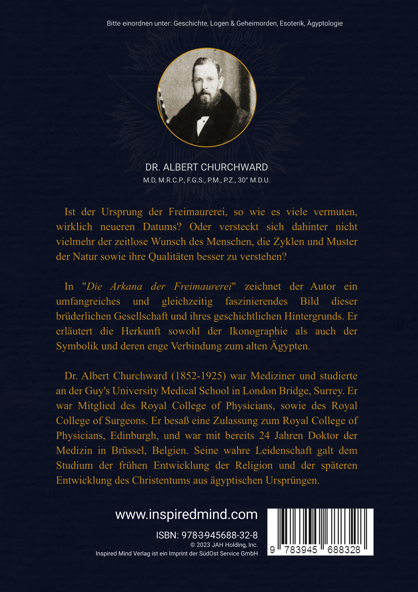 In "Die Arkana der Freimaurerei" offenbart der englische Doktor der Medizin und Freimaurer, Dr. Albert Churchward (1852-1925) den wahren Ursprung dieser Gesellschaft und die Hintergründe, die weit vor der ägyptischen Pharaonenzeit liegen. Der Autor belegt und untermauert mit zahlreichen Abbildungen seine Thesen. Ein faszinierender, ideologiefreier Einblick in die Geschichte dieser Bruderschaft. Das Buch ist hochwertig verarbeitet und zeichnet sich durch einen goldenen Seitenschnitt, ein goldenes Leseband, eine Goldfolienprägung sowie einen Relieflack auf dem Umschlag aus.