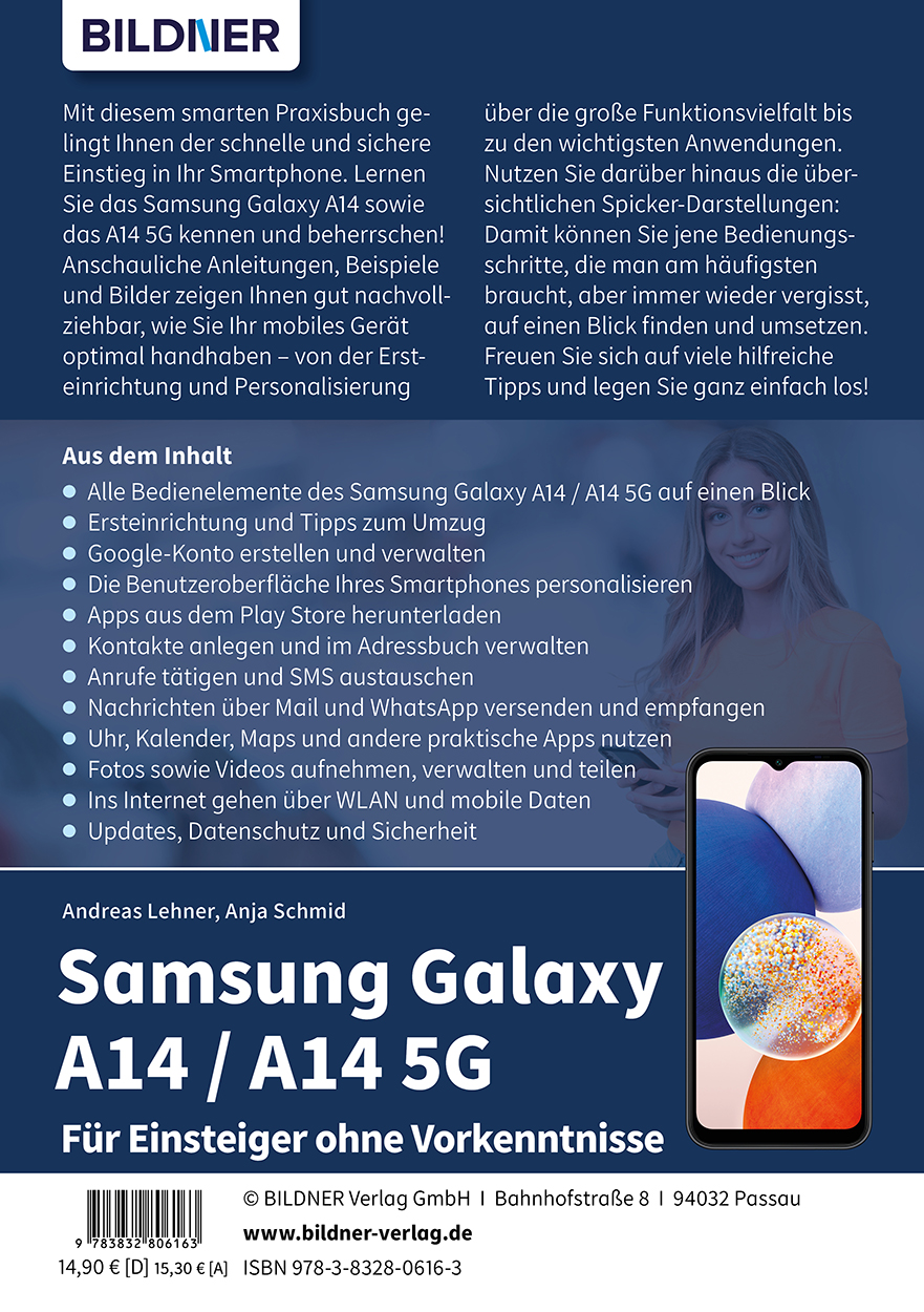 Mit diesem smarten Praxisbuch gelingt Ihnen der schnelle und sichere Einstieg in Ihr Smartphone. Lernen Sie das Samsung Galaxy A14 sowie das A14 5G kennen und beherrschen! Anschauliche Anleitungen, Beispiele und Bilder zeigen Ihnen gut nachvollziehbar, wie Sie Ihr mobiles Gerät optimal handhaben - von der Ersteinrichtung und Personalisierung über die große Funktionsvielfalt bis zu den wichtigsten Anwendungen. Nutzen Sie darüber hinaus die übersichtlichen Spicker-Darstellungen: Damit können Sie jene Bedienungsschritte, die man am häufigsten braucht, aber immer wieder vergisst, auf einen Blick finden und umsetzen. Freuen Sie sich auf viele hilfreiche Tipps und legen Sie ganz einfach los!