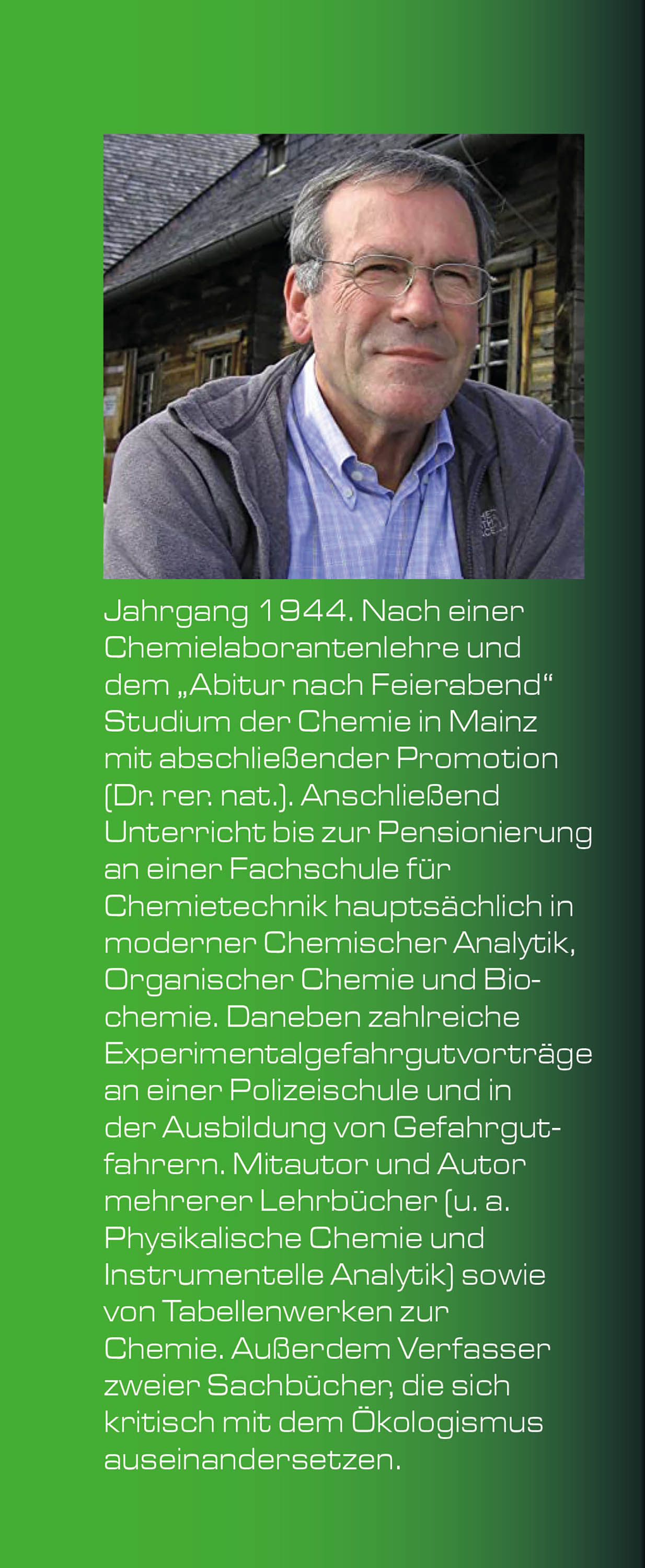 Dr. rer nat. Heinz Hug: Jahrgang 1944. Nach einer Chemielaborantenlehre und dem „Abitur nach Feierabend“ Studium der Chemie in Mainz mit abschließender Promotion (Dr. rer. nat.). Anschließend Unterricht bis zur Pensionierung an einer Fachschule für Chemietechnik hauptsächlich in moderner Chemischer Analytik, Organischer Chemie und Biochemie. Daneben zahlreiche Experimentalgefahrgutvorträge an einer Polizeischule und in der Ausbildung von Gefahrgutfahrern. Mitautor und Autor mehrerer Lehrbücher (u. a. Physikalische Chemie und Instrumentelle Analytik) sowie von Tabellenwerken zur Chemie. Außerdem Verfasser zweier Sachbücher, die sich kritisch mit dem Ökologismus auseinandersetzen.