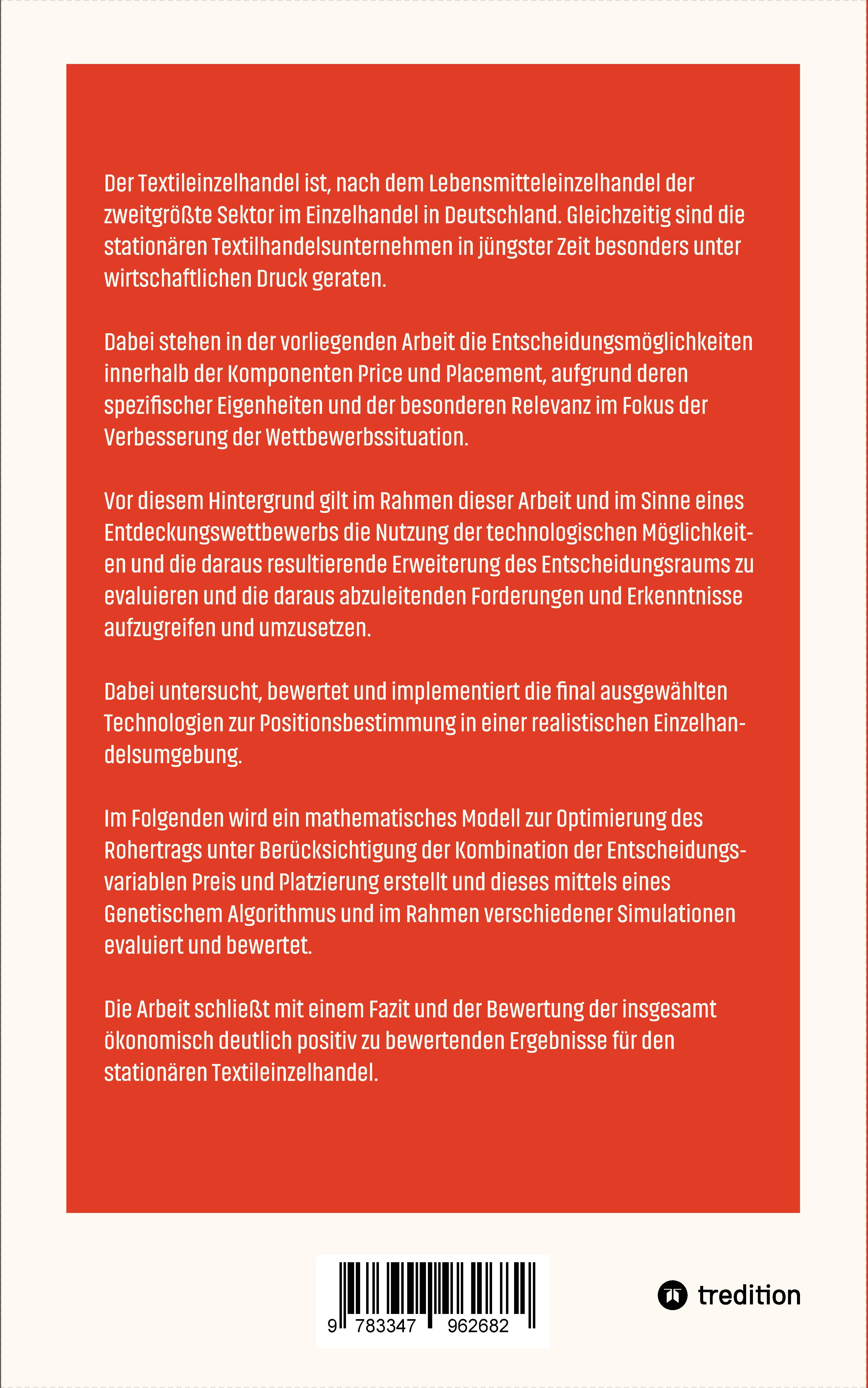 Der Textileinzelhandel ist, nach dem Lebensmitteleinzelhandel der zweitgrößte Sektor im Einzelhandel in Deutschland. Gleichzeitig sind die stationären Textilhandelsunternehmen in jüngster Zeit besonders unter wirtschaftlichen Druck geraten.Dabei stehen in der vorliegenden Arbeit die Entscheidungsmöglichkeiten innerhalb der Komponenten Price und Placement, aufgrund deren spezifischer Eigenheiten und der besonderen Relevanz im Fokus der Verbesserung der Wettbewerbssituation.Vor diesem Hintergrund gilt im Rahmen dieser Arbeit und im Sinne eines Entdeckungswettbewerbs die Nutzung der technologischen Möglichkeiten und die daraus resultierende Erweiterung des Entscheidungsraums zu evaluieren und die daraus abzuleitenden Forderungen und Erkenntnisse aufzugreifen und umzusetzen.Dabei untersucht, bewertet und implementiert die final ausgewählten Technologien zur Positionsbestimmung in einer realistischen Einzelhandelsumgebung.Im Folgenden wird ein mathematisches Modell zur Optimierung des Rohertrags unter Berücksichtigung der Kombination der Entscheidungsvariablen Preis und Platzierung erstellt und dieses mittels eines Genetischem Algorithmus und im Rahmen verschiedener Simulationen evaluiert und bewertet.Die Arbeit schließt mit einem Fazit und der Bewertung der insgesamt ökonomisch deutlich positiv zu bewertenden Ergebnisse für den stationären Textileinzelhandel.