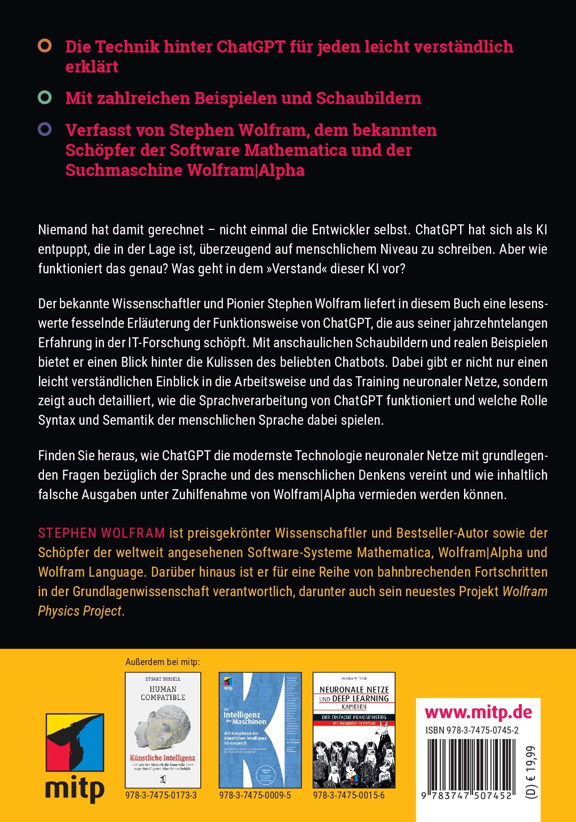 | Schlagworte | Algorithmus • bot ai • Buch • Chatbot • ChatGBT • Computerlinguistik • KI • ki chatbot • ki suchmaschine • Künstliche Intelligenz • künstliche intelligenz chatgbt • machine learning • Maschinelles Lernen • mitp • Natural Language Processing • Neuronale Netze • Neuronales Netz • neuronales Netzwerk • NLP • Suchmaschine • WolframAlpha |