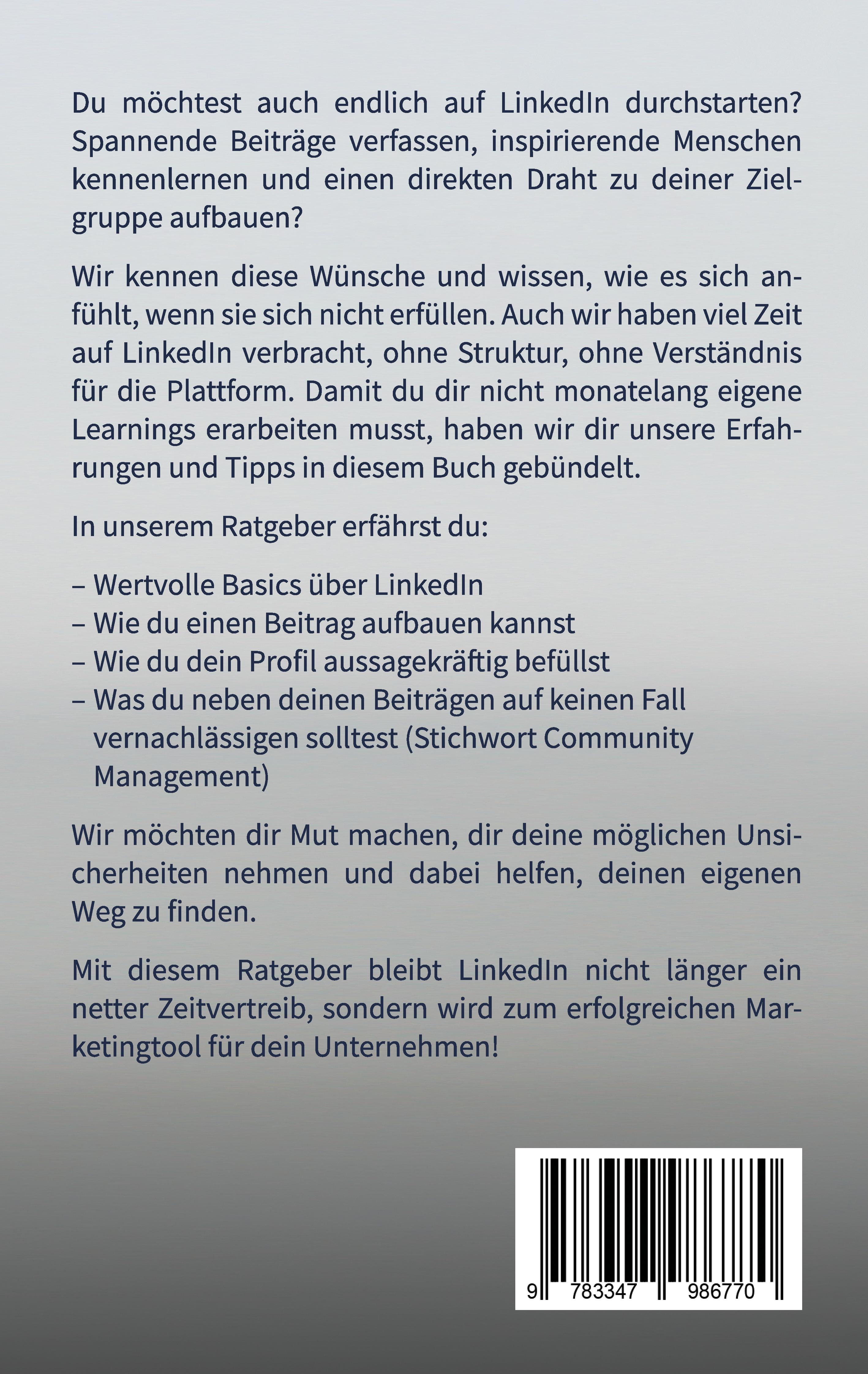 In diesem Ratgeber zum Thema Content-Marketing auf LinkedIn erfährst du wertvolle Tipps und Erfahrungsberichte, wie du dich überzeugend und persönlich präsentieren kannst. Wir möchten unseren Lesern Mut machen, in die Sichtbarkeit zu gehen und erklären, wie sie schneller mit spannenden Menschen in Kontakt treten können. Vom Profilaufbau über Themenfindung bis hin zum Beitragsaufbau - mit unserem Buch erhältst du detailliertes LinkedIn-Know-how, praktische Anleitungen und ganz viel Herz.