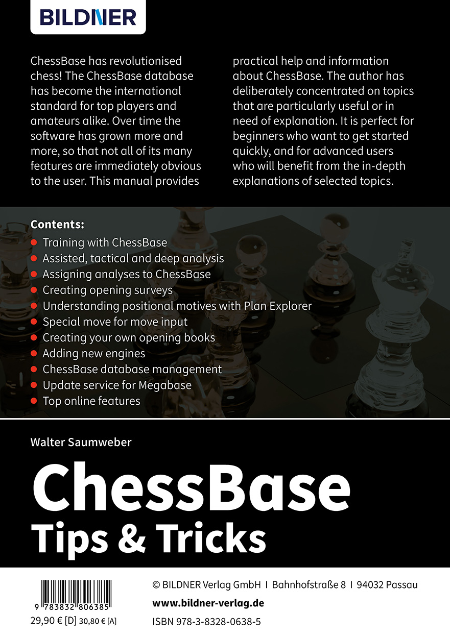 ChessBase has revolutionized chess! The ChessBase database has become the international standard for top players and amateurs alike. Over time the software has become more extensive and therefore more complex, so that not all of its many functions are immediately obvious to the user. This manual provides practical help and information about ChessBase. The author has deliberately concentrated on topics that are particularly useful or in need of explanation. Beginners are thus guaranteed a quick start. Advanced users will benefit from the detailed explanations of selected topics.