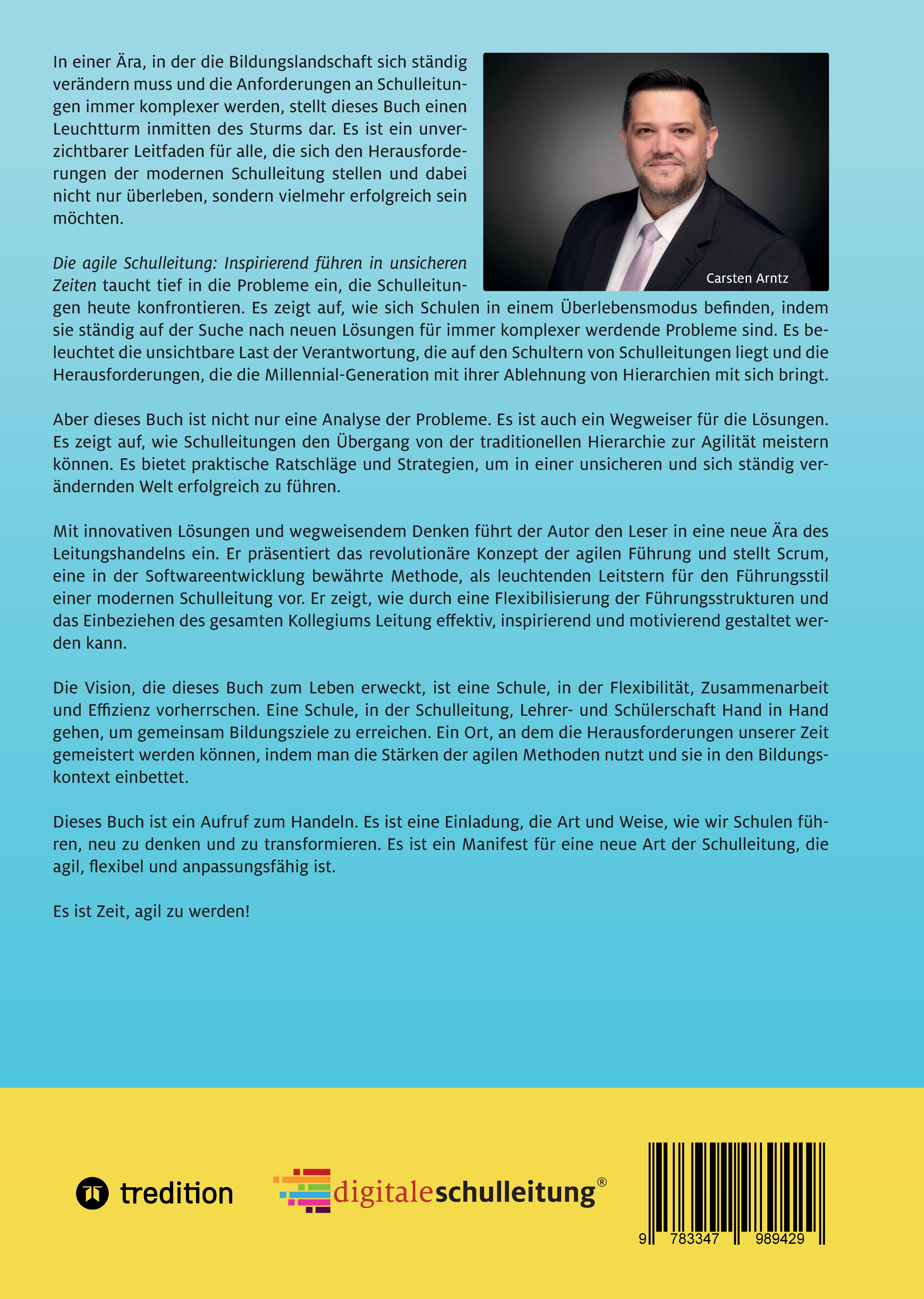 Carsten Arntz, Jahrgang 1974, ist Oberstudiendirektor i. K. und Schulleiter des Erzbischöflichen Berufskollegs Köln. Nach dem Abitur am Emil-Fischer-Gymnasium in Euskirchen studierte er an der Rheinischen Friedrich-Wilhelms-Universität Bonn und an der University of Nottingham die Fächer Anglistik und Pädagogik. Nach dem 1. Staatsexamen leistete er sein Lehramtsreferendariat am Studienseminar Jülich und am Gymnasium der Stadt Kerpen ab. Seit 2002 ist er am Erzbischöflichen Berufskolleg Köln als Lehrer tätig und wechselte dort 2018 in die Schulleitung; zuerst als stellvertretender Schulleiter und seit 2022 als Schulleiter. Arntz unterrichtet die Fächer Englisch, Erziehungswissenschaften, Informatik und Medienpädagogik. Er ist von der Industrie- und Handelskammer (IHK) jeweils mit Auszeichnung zertifizierte »Fachkraft für Digitalisierung, Selbst- und Zeitmanagement, Agile Führung und Agiles Projektmanagement«, von der Deutschen Akademie für pädagogische Führungskräfte (DAPF) zertifizierter »Digital Learning Leader« und vom Institut für Lernsysteme (ILS) zertifizierter »Multimedia-Designer«. Arntz ist zudem Mitglied des Digitalrates des Erzbistums Köln. Mit seinem Kollegen Stephan Kämper publizierte er 2021 im Tredition-Verlag das Fachbuch Die digitale Schulleitung und das papierlose Büro: Strategien und Praxisbeispiele für das digitale Management in der Schulverwaltung und 2022 im Raabe-Verlag (einem Tochterunternehmen der Klett-Gruppe) das Nachfolgewerk Digitales Schulmanagement: Schule professionell leiten und verwalten. Gemeinsam betreiben sie die Internetseite www.digitaleschulleitung.de Im Rahmen der Digitalen Fortbildungsoffensive für Schulleitungen des Landes Nordrhein-Westfalens entwickelten Arntz / Kämper in Kooperation mit der Raabe Verlags-GmbH mehrere Web-based Trainings zu dem Oberthema: »Wie geht digitale Schulverwaltung: Tipps für die digitale Schulverwaltung und digitales Selbstmanagement« und führen im Auftrag von Klett MINT Online-Schulungen für Schulleitungen, Lehrkräfte und die Schulaufsicht durch. Für den Raabe-Verlag publizieren sie regelmäßig Aufsätze zu Themen rund um Digitalisierung und künstliche Intelligenz im Schulleitungsalltag. Nebenberuflich interessiert er sich für Grafikdesign, Typografie, Fotografie, Video- und Musikproduktion. Arntz wohnt mit seiner Frau Sarah, den zwei Söhnen Janis und Elias, Tochter Emilia sowie Hündin Nika in Brühl bei Köln.