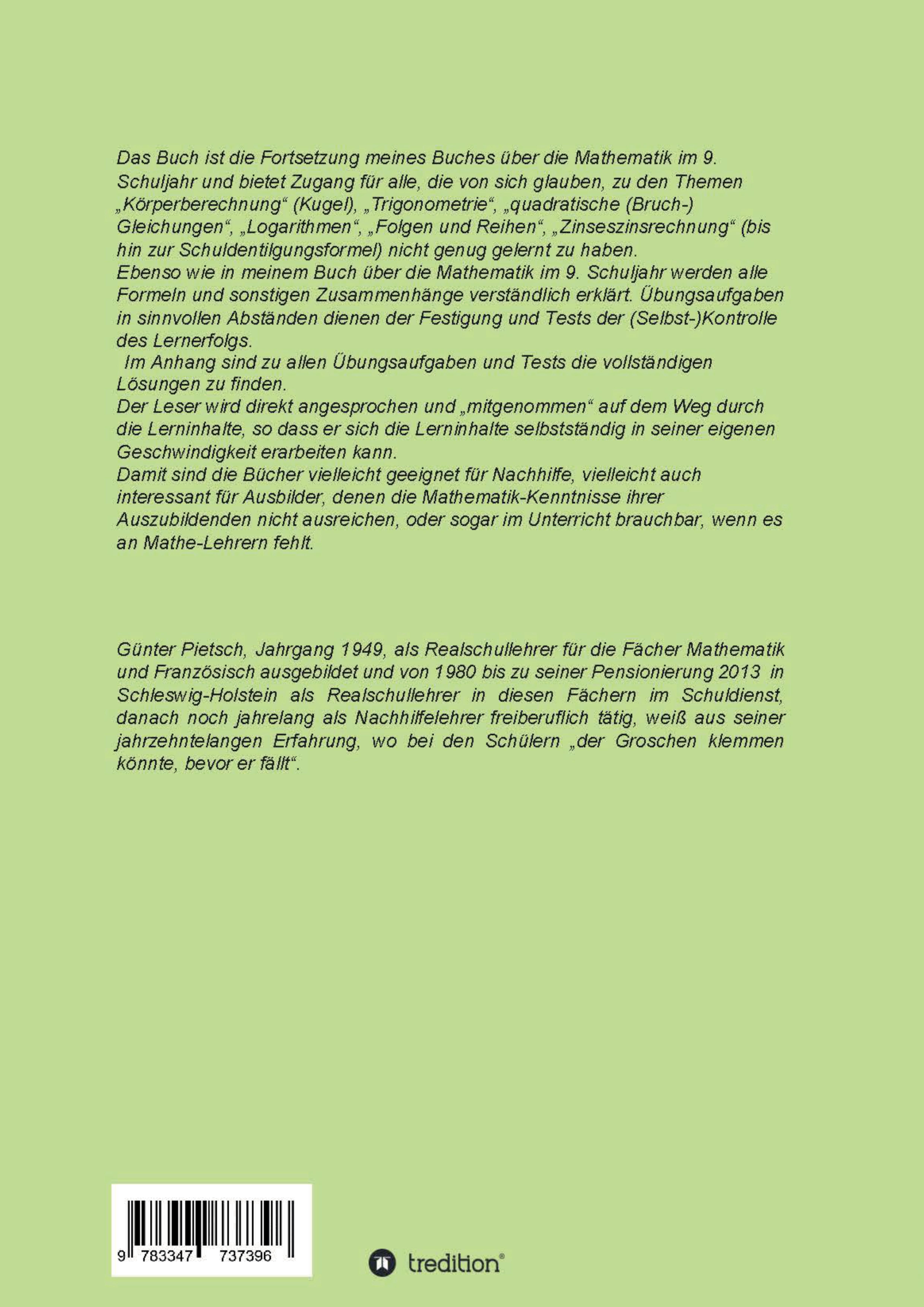 Es geht um die Mathematik, wie sie früher im 10. Schuljahr an der Realschule unterrichtet wurde: um Körperberechnung (Kugel, zusammengesetzte Körper), Trigonometrie, quadratische (Bruch-) Gleichungen, Logarithmen, (arithmetische und geometrische) Folgen und Reihen, Zinseszinsrechnung bis hin zur Schuldentilgungsformel. Die Lerninhalte gehen zum Teil (weit) über die im heutigen Unterricht behandelten Inhalte hinaus.