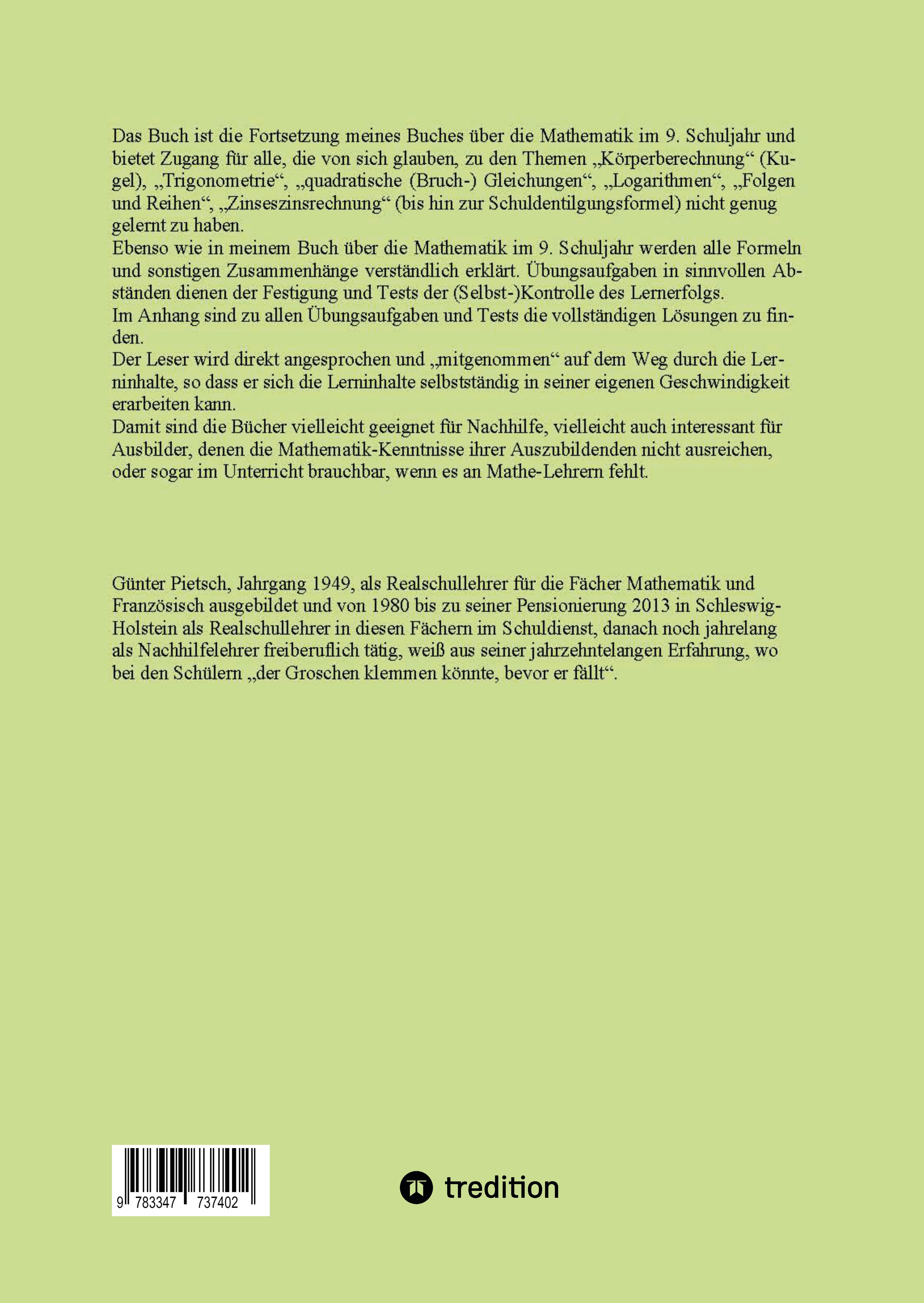 Günter Pietsch, Jahrgang 1949, als Realschullehrer für die Fächer Mathematik und Französisch ausgebildet und von 1980 bis zu seiner Pensionierung 2013 in Schleswig-Holstein als Realschullehrer in diesen Fächern im Schuldienst, danach noch jahrelang als Nachhilfelehrer freiberuflich tätig, weiß aus seiner jahrzehntelangen Erfahrung, wo bei den Schülern „der Groschen klemmen könnte, bevor er fällt“.