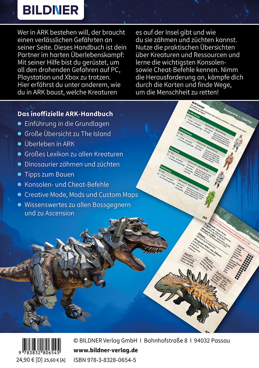 Hier erfährst du unter anderem, wie du in ARK baust, welche Kreaturen es auf der Insel gibt und wie du sie zähmen und züchten kannst. Nutze die praktischen Übersichten über Kreaturen und Ressourcen und lerne die wichtigsten Konsolen-sowie Cheat-Befehle kennen. Nimm die Herausforderung an, kämpfe dich durch die Karten und finde Wege, um die Menschheit zu retten!