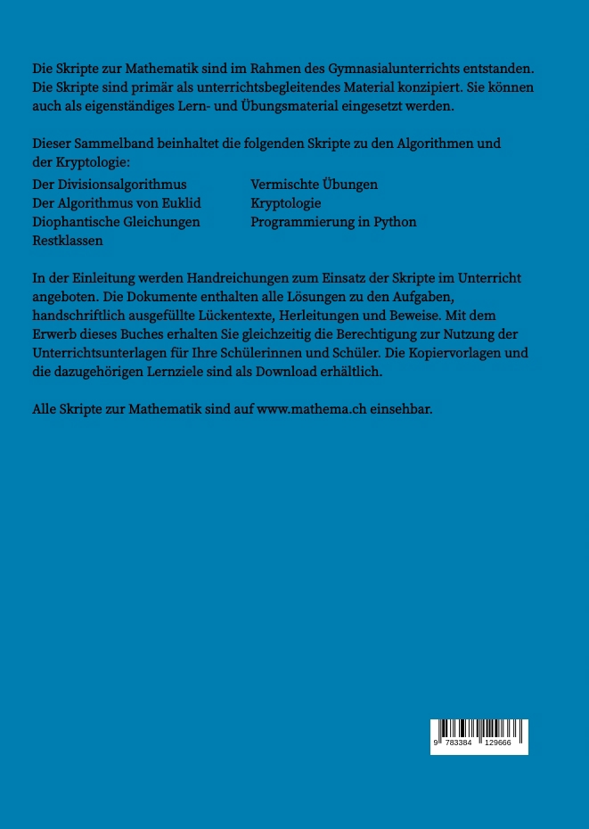 Die Skripte zur Mathematik sind im Rahmen des gymnasialen Unterrichts entstanden und sind primär als unterrichtsbegleitendes Material konzipiert. Sie können jedoch auch als eigenständiges Lern- und Übungsmaterial eingesetzt werden.Dieser Sammelband stellt die Skripte zu den Algorithmen und der Kryptologie zusammen:Der DivisionsalgorithmusDer Algorithmus von EuklidDiophantische GleichungenRestklassenVermischte ÜbungenKryptologieProgrammierung in PythonIn der Einleitung werden Handreichungen zum Einsatz der Skripte im Unterricht angeboten. Die Dokumente enthalten alle Lösungen zu den Aufgaben, handschriftlich ausgefüllte Lückentexte, Herleitungen und Beweise. Mit dem Erwerb dieses Buches erhalten Sie gleichzeitig die Berechtigung zur Nutzung der Unterrichtsunterlagen für Ihre Schülerinnen und Schüler. Die Kopiervorlagen und die dazugehörigen Lernziele sind als Download erhältlich.Alle Skripte einsehbar unter: www.mathema.ch
