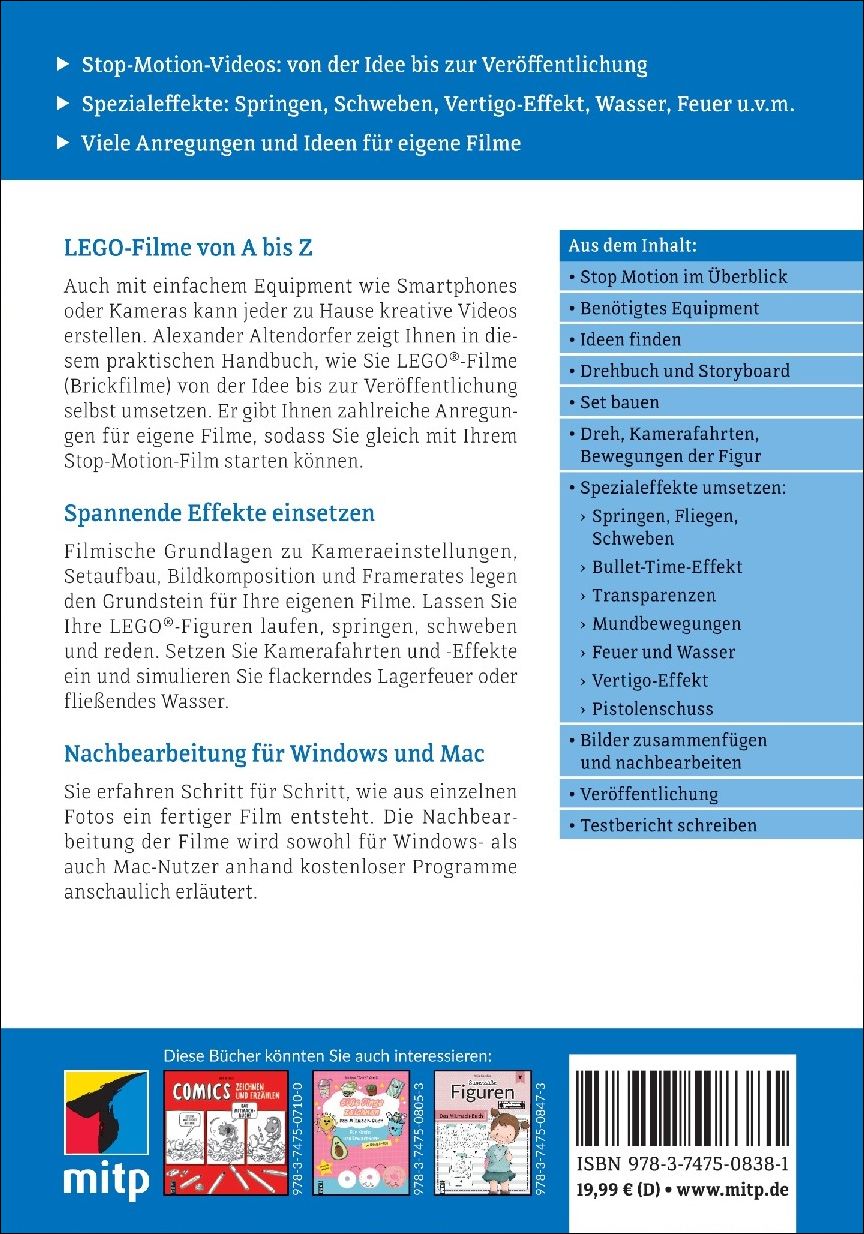 Anhand vieler Beispielbilder erklärt er den Setaufbau und zeigt anschaulich, wie aus einzelnen Fotos ein fertiger Film entsteht. Lassen Sie Ihre LEGO®-Figuren laufen, springen, schweben und reden. Setzen Sie Kamerafahrten und -Effekte ein und simulieren Sie fließendes Wasser oder flackerndes Lagerfeuer.