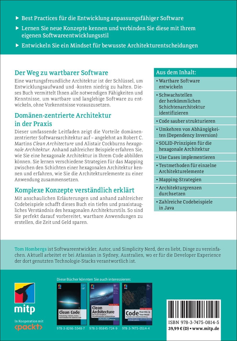 | Schlagworte | Adapter • Buch • Clean Architecture • Clean Code • Coden • Entwickler • Get Your Hands Dirty • Hexagonale Architektur • Informatik • Java • mitp • Patterns • Programmieren • Software Architektur • Software Entwickler • Softwareentwicklung • Software Entwicklung • Use Case • Wartbarkeit • Webanwendungen • Webentwicklung |