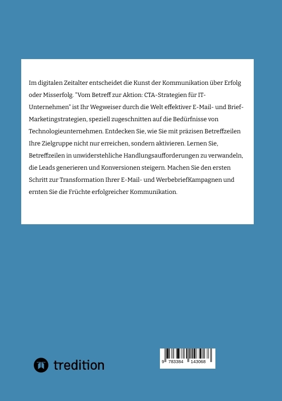 Im digitalen Zeitalter entscheidet die Kunst der Kommunikation über Erfolg oder Misserfolg. "Vom Betreff zur Aktion: CTA-Strategien für IT-Unternehmen" ist Ihr Wegweiser durch die Welt effektiver E-Mail- und Brief-Marketingstrategien, speziell zugeschnitten auf die Bedürfnisse von Technologieunternehmen. Entdecken Sie, wie Sie mit präzisen Betreffzeilen Ihre Zielgruppe nicht nur erreichen, sondern aktivieren. Lernen Sie, Betreffzeilen in unwiderstehliche Handlungsaufforderungen zu verwandeln, die Leads generieren und Konversionen steigern. Machen Sie den ersten Schritt zur Transformation Ihrer E-Mail- und WerbebriefKampagnen und ernten Sie die Früchte erfolgreicher Kommunikation.