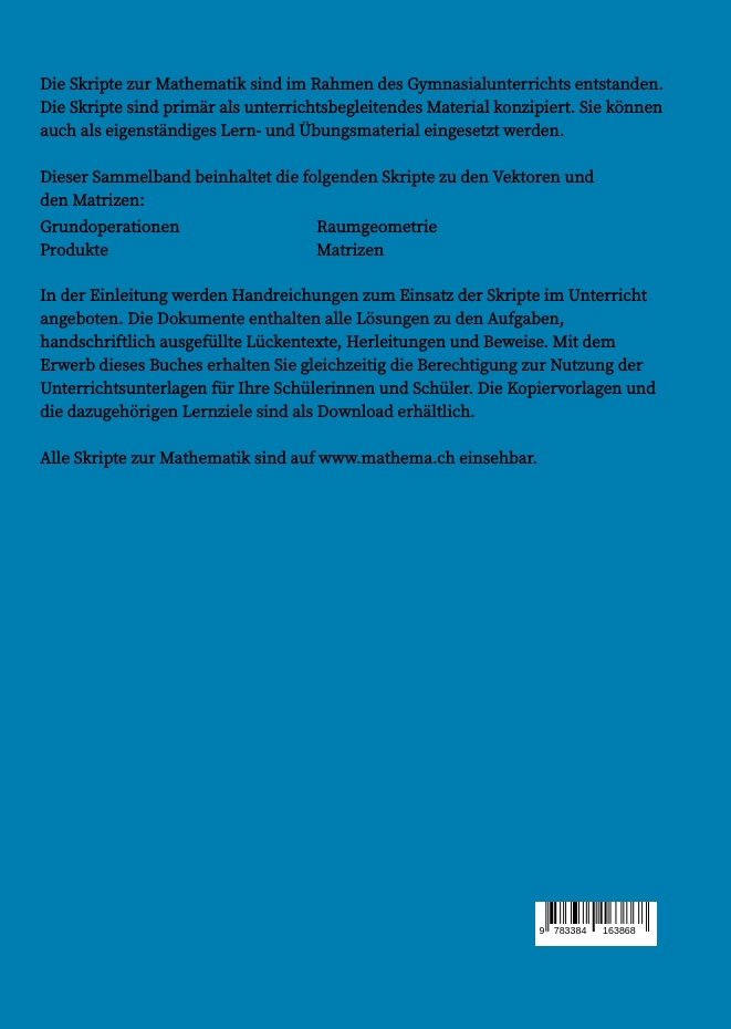 | Schlagworte | Mathematik • Matrizen • Raumgeometrie • Skripte • Unterrichtsmaterialien • Vektoren |