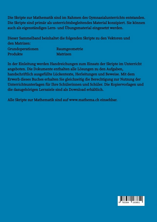 | Schlagworte | Mathematik • Matrizen • Raumgeometrie • Skripte • Unterrichtsmaterialien • Vektoren |