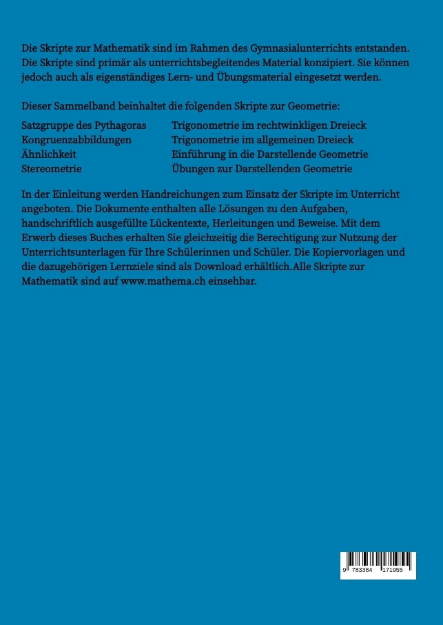Die Skripte zur Mathematik sind im Rahmen des gymnasialen Unterrichts entstanden und sind primär als unterrichtsbegleitendes Material konzipiert. Sie können jedoch auch als eigenständiges Lern- und Übungsmaterial eingesetzt werden.Dieser Sammelband stellt die Skripte zur Geometrie zusammen:Satzgruppe des PythagorasKongruenzabbildungenÄhnlichkeitStereometrieTrigonometrie im rechtwinkligen DreieckTrigonometrie im allgemeinen DreieckEinführung in die Darstellende GeometrieÜbungen zur Darstellenden GeometrieIn der Einleitung werden Handreichungen zum Einsatz der Skripte im Unterricht angeboten. Die Dokumente enthalten alle Lösungen zu den Aufgaben, handschriftlich ausgefüllte Lückentexte, Herleitungen und Beweise. Mit dem Erwerb dieses Buches erhalten Sie gleichzeitig die Berechtigung zur Nutzung der Unterrichtsunterlagen für Ihre Schülerinnen und Schüler. Die Kopiervorlagen und die dazugehörigen Lernziele sind als Download erhältlich.Alle Skripte zur Mathematik sind auf www.mathema.ch einsehbar.
