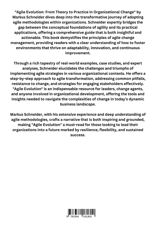 "Agile Evolution: From Theory to Practice in Organizational Change" by Markus Schneider dives deep into the transformative journey of adopting agile methodologies within organizations. Schneider expertly bridges the gap between the conceptual foundations of agility and its practical applications, offering a comprehensive guide that is both insightful and actionable. This book demystifies the principles of agile change management, providing readers with a clear understanding of how to foster environments that thrive on adaptability, innovation, and continuous improvement.Through a rich tapestry of real-world examples, case studies, and expert analyses, Schneider elucidates the challenges and triumphs of implementing agile strategies in various organizational contexts. He offers a step-by-step approach to agile transformation, addressing common pitfalls, resistance to change, and strategies for engaging stakeholders effectively. "Agile Evolution" is an indispensable resource for leaders, change agents, and anyone involved in organizational development, offering the tools and insights needed to navigate the complexities of change in today's dynamic business landscape.Markus Schneider, with his extensive experience and deep understanding of agile methodologies, crafts a narrative that is both inspiring and grounded, making "Agile Evolution" a must-read for those looking to lead their organizations into a future marked by resilience, flexibility, and sustained success.