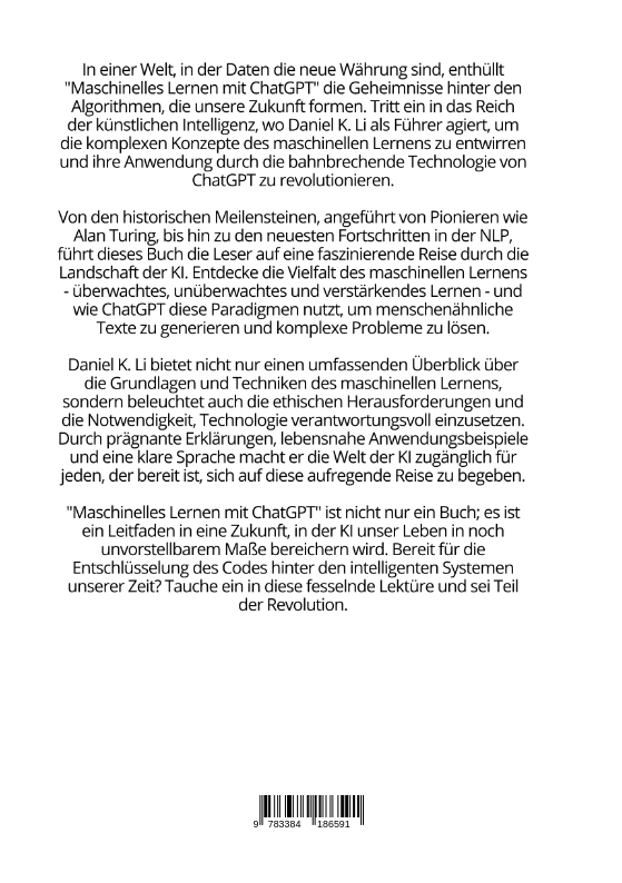 In einer Welt, in der Daten die neue Währung sind, enthüllt "Maschinelles Lernen mit ChatGPT" die Geheimnisse hinter den Algorithmen, die unsere Zukunft formen. Tritt ein in das Reich der künstlichen Intelligenz, wo Daniel K. Li als Führer agiert, um die komplexen Konzepte des maschinellen Lernens zu entwirren und ihre Anwendung durch die bahnbrechende Technologie von ChatGPT zu revolutionieren.Von den historischen Meilensteinen, angeführt von Pionieren wie Alan Turing, bis hin zu den neuesten Fortschritten in der NLP, führt dieses Buch die Leser auf eine faszinierende Reise durch die Landschaft der KI. Entdecke die Vielfalt des maschinellen Lernens - überwachtes, unüberwachtes und verstärkendes Lernen - und wie ChatGPT diese Paradigmen nutzt, um menschenähnliche Texte zu generieren und komplexe Probleme zu lösen.Daniel K. Li bietet nicht nur einen umfassenden Überblick über die Grundlagen und Techniken des maschinellen Lernens, sondern beleuchtet auch die ethischen Herausforderungen und die Notwendigkeit, Technologie verantwortungsvoll einzusetzen. Durch prägnante Erklärungen, lebensnahe Anwendungsbeispiele und eine klare Sprache macht er die Welt der KI zugänglich für jeden, der bereit ist, sich auf diese aufregende Reise zu begeben."Maschinelles Lernen mit ChatGPT" ist nicht nur ein Buch; es ist ein Leitfaden in eine Zukunft, in der KI unser Leben in noch unvorstellbarem Maße bereichern wird. Bereit für die Entschlüsselung des Codes hinter den intelligenten Systemen unserer Zeit? Tauche ein in diese fesselnde Lektüre und sei Teil der Revolution.