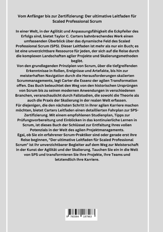 Vom Anfänger bis zur Zertifizierung: Der ultimative Leitfaden für Scaled Professional ScrumIn einer Welt, in der Agilität und Anpassungsfähigkeit die Eckpfeiler des Erfolgs sind, bietet Taylor C. Carters bahnbrechendes Werk einen umfassenden Überblick über das dynamische Feld des Scaled Professional Scrum (SPS). Dieser Leitfaden ist mehr als nur ein Buch; es ist eine unverzichtbare Ressource für jeden, der sich auf die Reise durch die komplexen Landschaften agiler Projekte und Skalierungsmethoden begibt.Von den grundlegenden Prinzipien von Scrum, über die tiefgreifenden Erkenntnisse in Rollen, Ereignisse und Artefakte, bis hin zur meisterhaften Navigation durch die Herausforderungen skalierten Scrummanagements, legt Carter die Essenz der agilen Transformation offen. Das Buch beleuchtet den Weg von den historischen Ursprüngen von Scrum bis zu seinen modernen Anwendungen in verschiedenen Branchen, veranschaulicht durch Fallstudien, die sowohl die Theorie als auch die Praxis der Skalierung in der realen Welt erfassen.Für diejenigen, die den nächsten Schritt in ihrer agilen Karriere machen möchten, bietet Carters Leitfaden einen detaillierten Fahrplan zur SPS-Zertifizierung. Mit einem empfohlenen Studienplan, Tipps zur Prüfungsvorbereitung und Einblicken in das kontinuierliche Lernen in Scrum, ist dieses Buch der Schlüssel zur Entfaltung Ihres vollen Potenzials in der Welt des agilen Projektmanagements.Egal, ob Sie ein erfahrener Scrum-Praktiker sind oder gerade erst Ihre Reise beginnen, "Der ultimative Leitfaden für Scaled Professional Scrum" ist Ihr unverzichtbarer Begleiter auf dem Weg zur Meisterschaft in der Kunst der Agilität und der Skalierung. Tauchen Sie ein in die Welt von SPS und transformieren Sie Ihre Projekte, Ihre Teams und letztendlich Ihre Karriere.