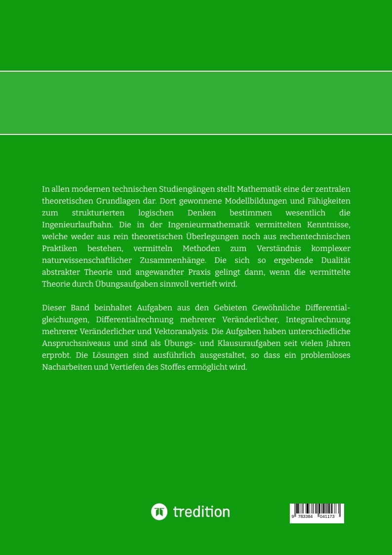 Der Aufgabenband beinhaltet Aufgaben aus den Gebieten Gewöhnliche Differentialgleichungen, Differentialrechnung mehrerer Veränderlicher, Integralrechnung mehrerer Veränderlicher und Vektoranalysis.
