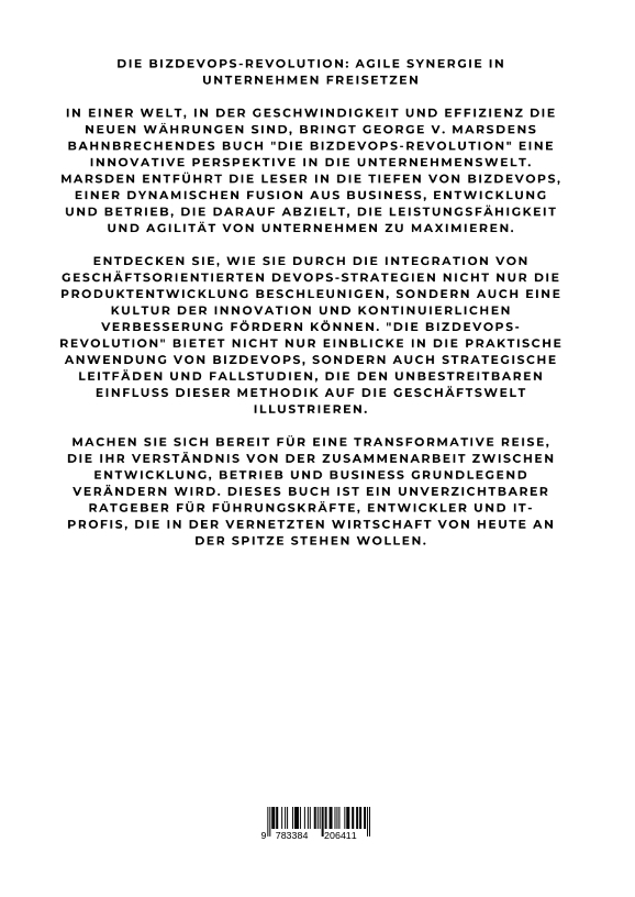 Die BizDevOps-Revolution: Agile Synergie in Unternehmen freisetzen In einer Welt, in der Geschwindigkeit und Effizienz die neuen Währungen sind, bringt George V. Marsdens bahnbrechendes Buch "Die BizDevOps-Revolution" eine innovative Perspektive in die Unternehmenswelt. Marsden entführt die Leser in die Tiefen von BizDevOps, einer dynamischen Fusion aus Business, Entwicklung und Betrieb, die darauf abzielt, die Leistungsfähigkeit und Agilität von Unternehmen zu maximieren.Entdecken Sie, wie Sie durch die Integration von geschäftsorientierten DevOps-Strategien nicht nur die Produktentwicklung beschleunigen, sondern auch eine Kultur der Innovation und kontinuierlichen Verbesserung fördern können. "Die BizDevOps-Revolution" bietet nicht nur Einblicke in die praktische Anwendung von BizDevOps, sondern auch strategische Leitfäden und Fallstudien, die den unbestreitbaren Einfluss dieser Methodik auf die Geschäftswelt illustrieren.Machen Sie sich bereit für eine transformative Reise, die Ihr Verständnis von der Zusammenarbeit zwischen Entwicklung, Betrieb und Business grundlegend verändern wird. Dieses Buch ist ein unverzichtbarer Ratgeber für Führungskräfte, Entwickler und IT-Profis, die in der vernetzten Wirtschaft von heute an der Spitze stehen wollen.