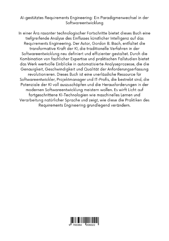 In einer Ära rasanter technologischer Fortschritte bietet dieses Buch eine tiefgreifende Analyse des Einflusses künstlicher Intelligenz auf das Requirements Engineering. Der Autor, Gordon B. Bach, entfaltet die transformative Kraft der KI, die traditionelle Verfahren in der Softwareentwicklung neu definiert und effizienter gestaltet. Durch die Kombination von fachlicher Expertise und praktischen Fallstudien bietet das Werk wertvolle Einblicke in automatisierte Analyseprozesse, die die Genauigkeit, Geschwindigkeit und Qualität der Anforderungserfassung revolutionieren. Dieses Buch ist eine unerlässliche Ressource für Softwareentwickler, Projektmanager und IT-Profis, die bestrebt sind, die Potenziale der KI voll auszuschöpfen und die Herausforderungen in der modernen Softwareentwicklung meistern wollen. Es wirft Licht auf fortgeschrittene KI-Technologien wie maschinelles Lernen und Verarbeitung natürlicher Sprache und zeigt, wie diese die Praktiken des Requirements Engineering grundlegend verändern.