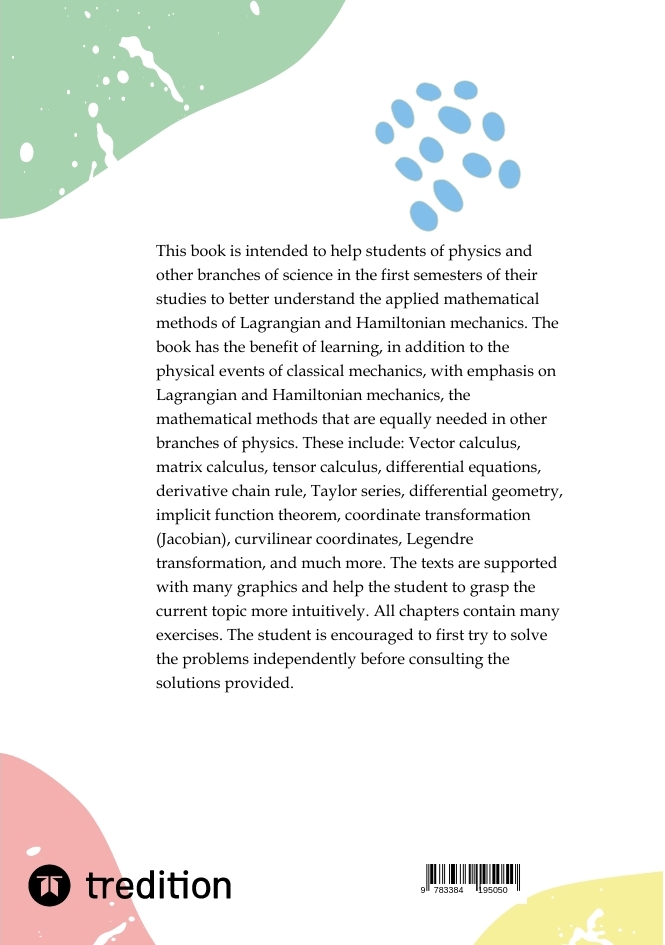 This book is intended to help students of physics and other branches of science in the first semesters of their studies to better understand the applied mathematical methods of Lagrangian and Hamiltonian mechanics. The book has the benefit of learning, in addition to the physical processes of classical mechanics, with focus on Lagrangian and Hamiltonian mechanics, the mathematical methods that are equally needed in other branches of physics. These include: Vector calculus, matrix calculus, tensor calculus, differential equations, derivative chain rule, Taylor series, differential geometry, implicit function theorem, coordinate transformation (Jacobian), curvilinear coordinates, Legendre transformation, and much more.Chapter 1 describes the basics of Newtonian mechanics in a review. In addition to Newton's laws, the two-body problem is dealt with in detail. Kepler's laws are a by-product of this.Chapter 2 explains the origins of the variation technique with its historical origin in the brachistochrone problem. After introducing generalised coordinates and applying Newton's principle of determinacy, the Lagrangian approachfor mechanical systems is derived. The conservation laws play an important role in this context. Applications are shown for motions in a central field. The Lagrangian dynamics for oscillations with the various modes is discussed in depth. The application of linear algebra (eigenvectors, normal coordinates) is treated in great detail.Chapter 3 develops the Hamiltonian dynamics for mechanical systems. The transition from the configuration space of Lagrangian mechanics to the symplectic phase space of Hamiltonian mechanics (Legendre transformation) isdiscussed. An additional section deals with Routh's procedure, which can be described as a mixture of Lagrangian and Hamiltonian mechanics.The extension of the permissible transformations of the variables of Hamiltonian mechanics in comparison to Lagrangian approach leads us to the canonical transformations, Chapter 4. Here the generating functions of the canonical transformations are derived with the help of the Legendre transformation. The symplectic relationship of canonical transformations is clearly worked out.In Chapter 5, the Hamiltonian equations of motion are described using the Poisson formalism, which provides the equations of motion with a symmetrical form. Further topics such as constants of motion, Jacobi identity, canonicalinvariance, Liouville's theorem, etc. are treated in detail.Hamilton-Jacobi theory, Chapter 6, considers the interesting approach of finding a canonical transformation in which the phase space coordinates and the new Hamiltonian are all constant. This is discussed in depth and the student is given a procedure for solving a mechanical system.A canonical transformation, the so-called action-angle variable, which is discussed in Chapter 7, is suitable for periodic phase orbits. The important field of adiabatic invariants with reference to quantum mechanics is also discussed.The texts are supported with many graphics and help the student to grasp the current topic more intuitively. All chapters contain many exercises. The student is encouraged to first try to solve the exercises independently before consulting the solutions provided.