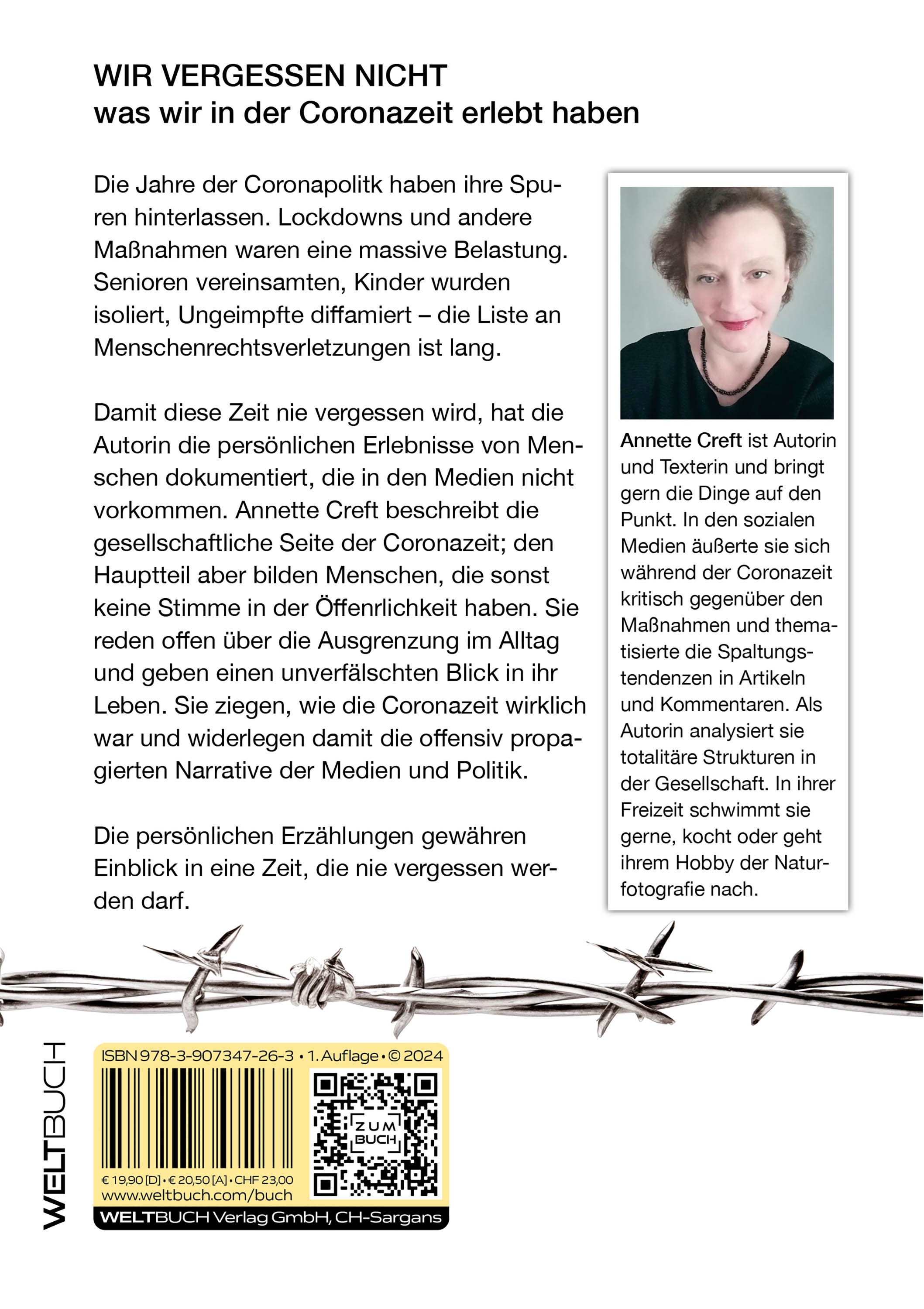 Damit diese Zeit nie vergessen wird, hat die Autorin die persönlichen Erlebnisse von Menschen dokumentiert, die in den Medien nicht vorkommen. Annette Creft beschreibt die gesellschaftliche Seite der Coronazeit; den Hauptteil aber bilden Menschen, die sonst keine Stimme in der Öffentlichkeit haben. Sie reden offen über die Ausgrenzung im Alltag und geben einen unverfälschten Blick in ihr Leben. Sie zeigen, wie die Coronazeit wirklich war und widerlegen damit die offensiv propagierten Narrative der Medien und Politik.
