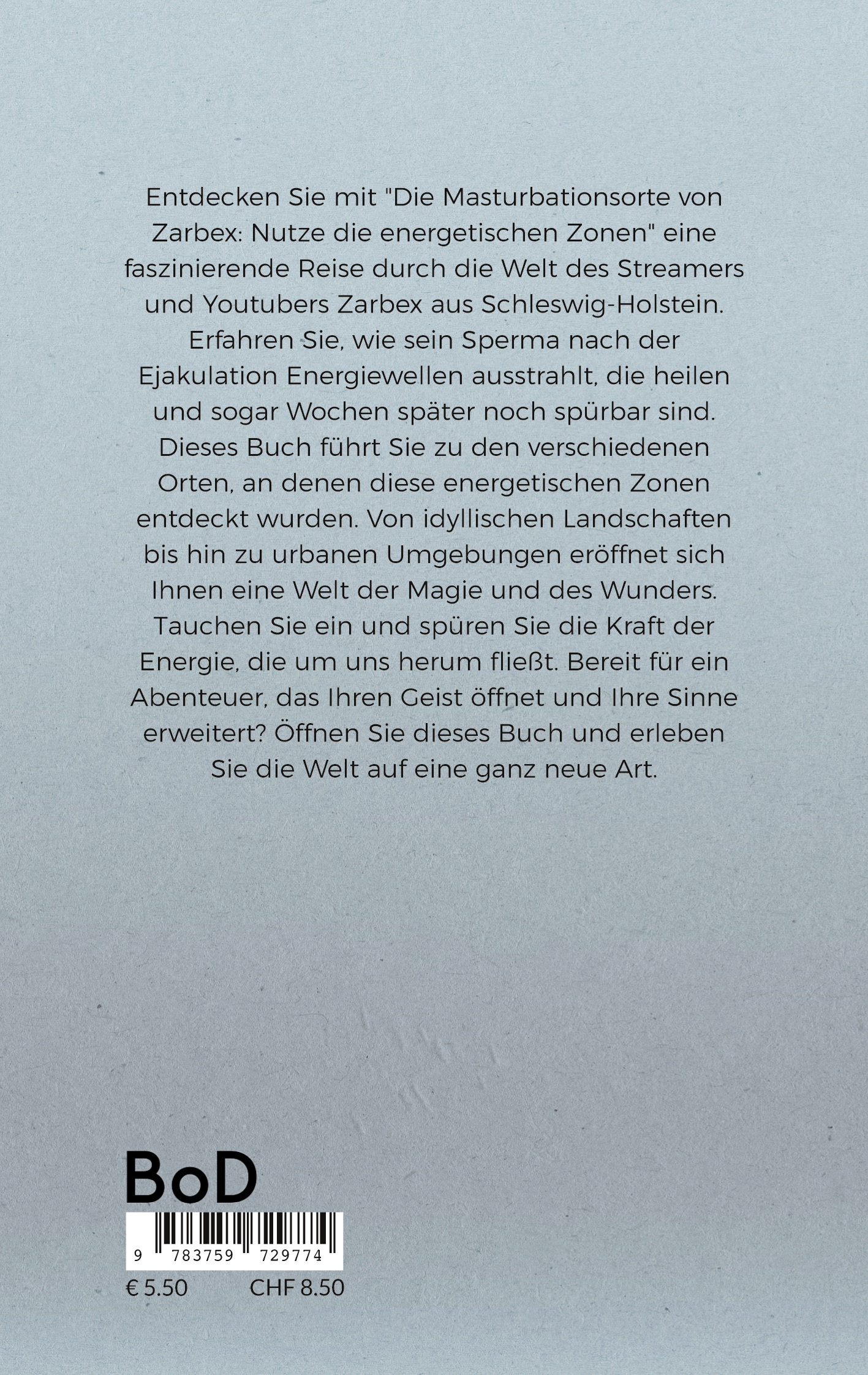 Entdecken Sie mit "Die Masturbationsorte von Zarbex: Nutze die energetischen Zonen" eine faszinierende Reise durch die Welt des Streamers und Youtubers Zarbex aus Schleswig-Holstein. Erfahren Sie, wie sein Sperma nach der Ejakulation Energiewellen ausstrahlt, die heilen und sogar Wochen später noch spürbar sind. Dieses Buch führt Sie zu den verschiedenen Orten, an denen diese energetischen Zonen entdeckt wurden. Von idyllischen Landschaften bis hin zu urbanen Umgebungen eröffnet sich Ihnen eine Welt der Magie und des Wunders. Tauchen Sie ein und spüren Sie die Kraft der Energie, die um uns herum fließt. Bereit für ein Abenteuer, das Ihren Geist öffnet und Ihre Sinne erweitert? Öffnen Sie dieses Buch und erleben Sie die Welt auf eine ganz neue Art.