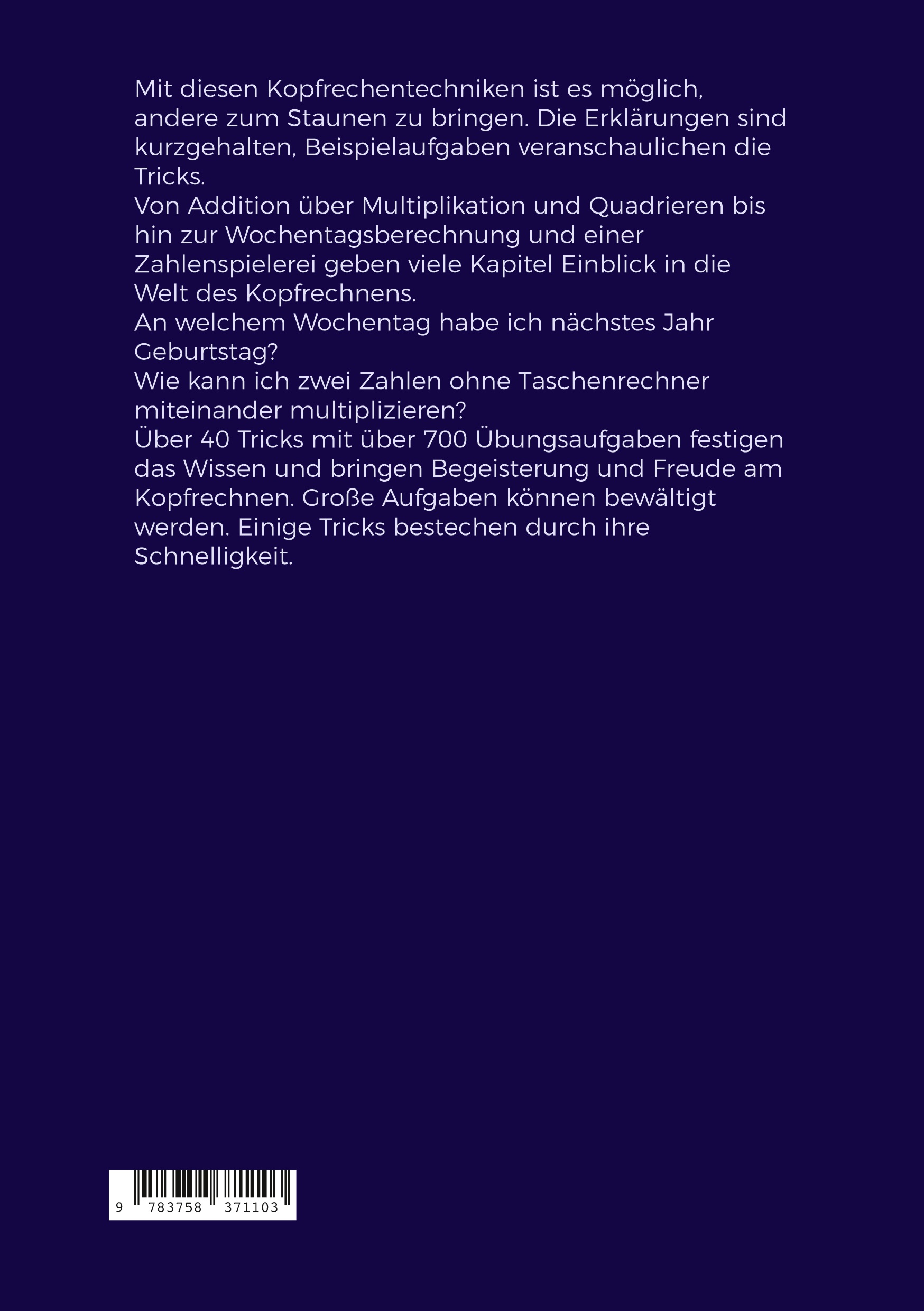 Mit diesen Kopfrechentechniken ist es möglich, andere zum Staunen zu bringen. Die Erklärungen sind kurzgehalten, Beispielaufgaben veranschaulichen die Tricks.Von Addition über Multiplikation und Quadrieren bis hin zur Wochentagsberechnung und einer Zahlenspielerei geben viele Kapitel Einblick in die Welt des Kopfrechnens. An welchem Wochentag habe ich nächstes Jahr Geburtstag?Wie kann ich zwei Zahlen ohne Taschenrechner miteinander multiplizieren?Über 40 Tricks mit über 700 Übungsaufgaben festigen das Wissen und bringen Begeisterung und Freude am Kopfrechnen. Große Aufgaben können bewältigt werden. Einige Tricks bestechen durch ihre Schnelligkeit.