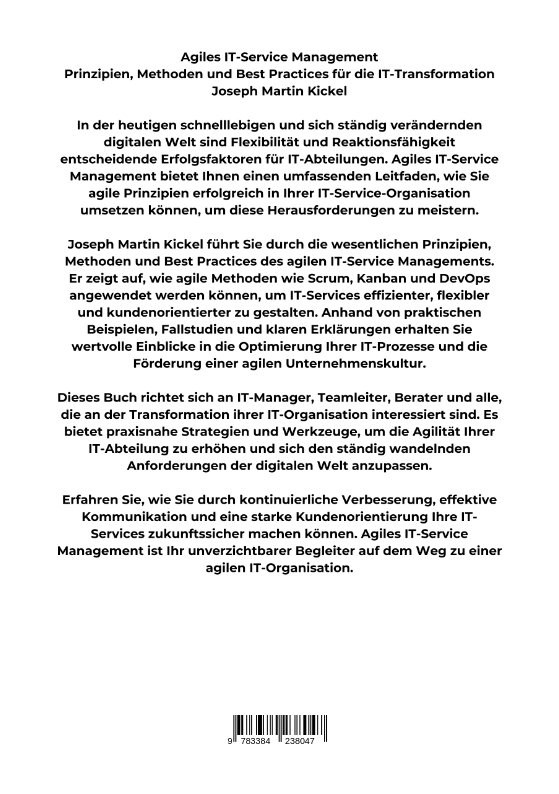 In der heutigen schnelllebigen und sich ständig verändernden digitalen Welt sind Flexibilität und Reaktionsfähigkeit entscheidende Erfolgsfaktoren für IT-Abteilungen. Agiles IT-Service Management bietet Ihnen einen umfassenden Leitfaden, wie Sie agile Prinzipien erfolgreich in Ihrer IT-Service-Organisation umsetzen können, um diese Herausforderungen zu meistern.Joseph Martin Kickel führt Sie durch die wesentlichen Prinzipien, Methoden und Best Practices des agilen IT-Service Managements. Er zeigt auf, wie agile Methoden wie Scrum, Kanban und DevOps angewendet werden können, um IT-Services effizienter, flexibler und kundenorientierter zu gestalten. Anhand von praktischen Beispielen, Fallstudien und klaren Erklärungen erhalten Sie wertvolle Einblicke in die Optimierung Ihrer IT-Prozesse und die Förderung einer agilen Unternehmenskultur.Dieses Buch richtet sich an IT-Manager, Teamleiter, Berater und alle, die an der Transformation ihrer IT-Organisation interessiert sind. Es bietet praxisnahe Strategien und Werkzeuge, um die Agilität Ihrer IT-Abteilung zu erhöhen und sich den ständig wandelnden Anforderungen der digitalen Welt anzupassen.Erfahren Sie, wie Sie durch kontinuierliche Verbesserung, effektive Kommunikation und eine starke Kundenorientierung Ihre IT-Services zukunftssicher machen können. Agiles IT-Service Management ist Ihr unverzichtbarer Begleiter auf dem Weg zu einer agilen IT-Organisation.
