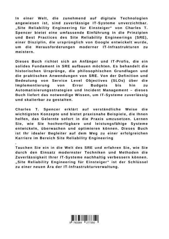 In einer Welt, die zunehmend auf digitale Technologien angewiesen ist, sind zuverlässige IT-Systeme unverzichtbar. "Site Reliability Engineering für Einsteiger" von Charles T. Spencer bietet eine umfassende Einführung in die Prinzipien und Best Practices des Site Reliability Engineerings (SRE), einer Disziplin, die ursprünglich von Google entwickelt wurde, um die Herausforderungen moderner IT-Infrastrukturen zu meistern.Dieses Buch richtet sich an Anfänger und IT-Profis, die ein solides Fundament in SRE aufbauen möchten. Es behandelt die historischen Ursprünge, die philosophischen Grundlagen und die praktischen Anwendungen von SRE. Von der Definition und Bedeutung von Service Level Objectives (SLOs) über die Implementierung von Error Budgets bis hin zu Automatisierungsstrategien und Incident Management - dieses Buch liefert das notwendige Wissen, um IT-Systeme zuverlässig und skalierbar zu gestalten.Charles T. Spencer erklärt auf verständliche Weise die wichtigsten Konzepte und bietet praxisnahe Beispiele, die Ihnen helfen, das Gelernte sofort in die Praxis umzusetzen. Lernen Sie, wie Sie hochverfügbare und leistungsfähige Systeme entwickeln, überwachen und optimieren können. Dieses Buch ist Ihr idealer Begleiter auf dem Weg zu einer erfolgreichen Karriere im Bereich Site Reliability Engineering.Tauchen Sie ein in die Welt des SRE und erfahren Sie, wie Sie durch den Einsatz modernster Techniken und Methoden die Zuverlässigkeit Ihrer IT-Systeme nachhaltig verbessern können. "Site Reliability Engineering für Einsteiger" ist der Schlüssel zu einer neuen Ära der IT-Infrastrukturverwaltung.