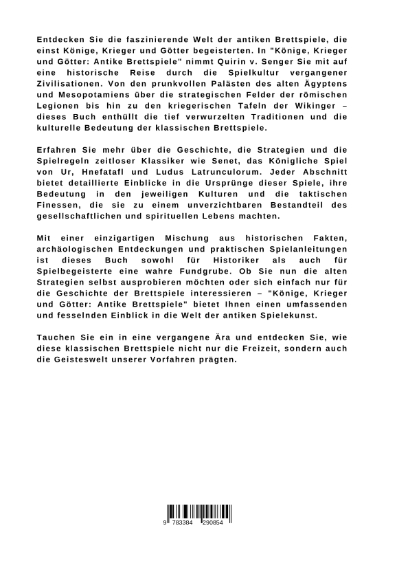 Entdecken Sie die faszinierende Welt der antiken Brettspiele, die einst Könige, Krieger und Götter begeisterten. In "Könige, Krieger und Götter: Antike Brettspiele" nimmt Quirin v. Senger Sie mit auf eine historische Reise durch die Spielkultur vergangener Zivilisationen. Von den prunkvollen Palästen des alten Ägyptens und Mesopotamiens über die strategischen Felder der römischen Legionen bis hin zu den kriegerischen Tafeln der Wikinger - dieses Buch enthüllt die tief verwurzelten Traditionen und die kulturelle Bedeutung der klassischen Brettspiele.Erfahren Sie mehr über die Geschichte, die Strategien und die Spielregeln zeitloser Klassiker wie Senet, das Königliche Spiel von Ur, Hnefatafl und Ludus Latrunculorum. Jeder Abschnitt bietet detaillierte Einblicke in die Ursprünge dieser Spiele, ihre Bedeutung in den jeweiligen Kulturen und die taktischen Finessen, die sie zu einem unverzichtbaren Bestandteil des gesellschaftlichen und spirituellen Lebens machten.Mit einer einzigartigen Mischung aus historischen Fakten, archäologischen Entdeckungen und praktischen Spielanleitungen ist dieses Buch sowohl für Historiker als auch für Spielbegeisterte eine wahre Fundgrube. Ob Sie nun die alten Strategien selbst ausprobieren möchten oder sich einfach nur für die Geschichte der Brettspiele interessieren - "Könige, Krieger und Götter: Antike Brettspiele" bietet Ihnen einen umfassenden und fesselnden Einblick in die Welt der antiken Spielekunst.Tauchen Sie ein in eine vergangene Ära und entdecken Sie, wie diese klassischen Brettspiele nicht nur die Freizeit, sondern auch die Geisteswelt unserer Vorfahren prägten.
