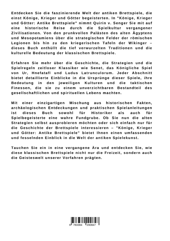 Entdecken Sie die faszinierende Welt der antiken Brettspiele, die einst Könige, Krieger und Götter begeisterten. In "Könige, Krieger und Götter: Antike Brettspiele" nimmt Quirin v. Senger Sie mit auf eine historische Reise durch die Spielkultur vergangener Zivilisationen. Von den prunkvollen Palästen des alten Ägyptens und Mesopotamiens über die strategischen Felder der römischen Legionen bis hin zu den kriegerischen Tafeln der Wikinger - dieses Buch enthüllt die tief verwurzelten Traditionen und die kulturelle Bedeutung der klassischen Brettspiele.Erfahren Sie mehr über die Geschichte, die Strategien und die Spielregeln zeitloser Klassiker wie Senet, das Königliche Spiel von Ur, Hnefatafl und Ludus Latrunculorum. Jeder Abschnitt bietet detaillierte Einblicke in die Ursprünge dieser Spiele, ihre Bedeutung in den jeweiligen Kulturen und die taktischen Finessen, die sie zu einem unverzichtbaren Bestandteil des gesellschaftlichen und spirituellen Lebens machten.Mit einer einzigartigen Mischung aus historischen Fakten, archäologischen Entdeckungen und praktischen Spielanleitungen ist dieses Buch sowohl für Historiker als auch für Spielbegeisterte eine wahre Fundgrube. Ob Sie nun die alten Strategien selbst ausprobieren möchten oder sich einfach nur für die Geschichte der Brettspiele interessieren - "Könige, Krieger und Götter: Antike Brettspiele" bietet Ihnen einen umfassenden und fesselnden Einblick in die Welt der antiken Spielekunst.Tauchen Sie ein in eine vergangene Ära und entdecken Sie, wie diese klassischen Brettspiele nicht nur die Freizeit, sondern auch die Geisteswelt unserer Vorfahren prägten.