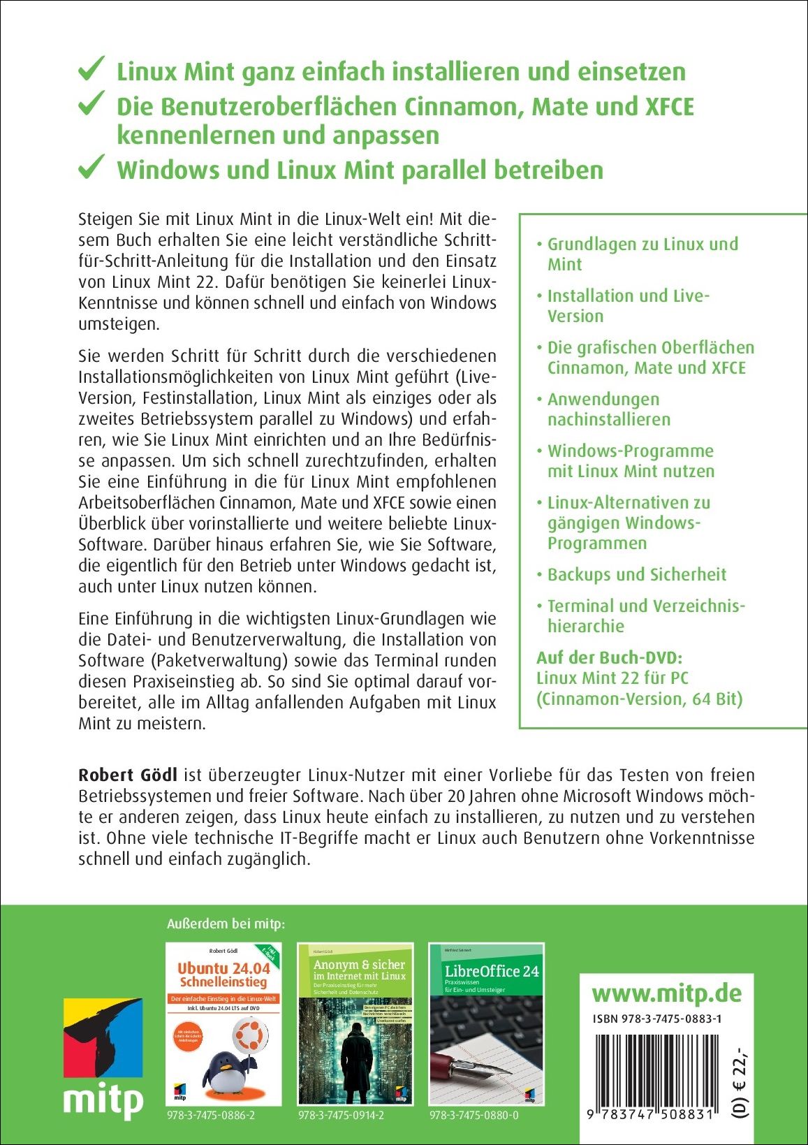 Sie werden Schritt für Schritt durch die verschiedenen Installationsmöglichkeiten von Linux Mint geführt (Live-Version, Festinstallation, Linux Mint als einziges oder als zweites Betriebssystem parallel zu Windows) und erfahren, wie Sie Linux Mint einrichten und an Ihre Bedürfnisse anpassen. Um sich schnell zurechtzufinden, erhalten Sie eine Einführung in die für Linux Mint empfohlenen Arbeitsoberflächen Cinnamon, Mate und XFCE sowie einen Überblick über vorinstallierte und weitere beliebte Linux-Software. Darüber hinaus erfahren Sie, wie Sie Software, die eigentlich für den Betrieb unter Windows gedacht ist, auch unter Linux nutzen können.